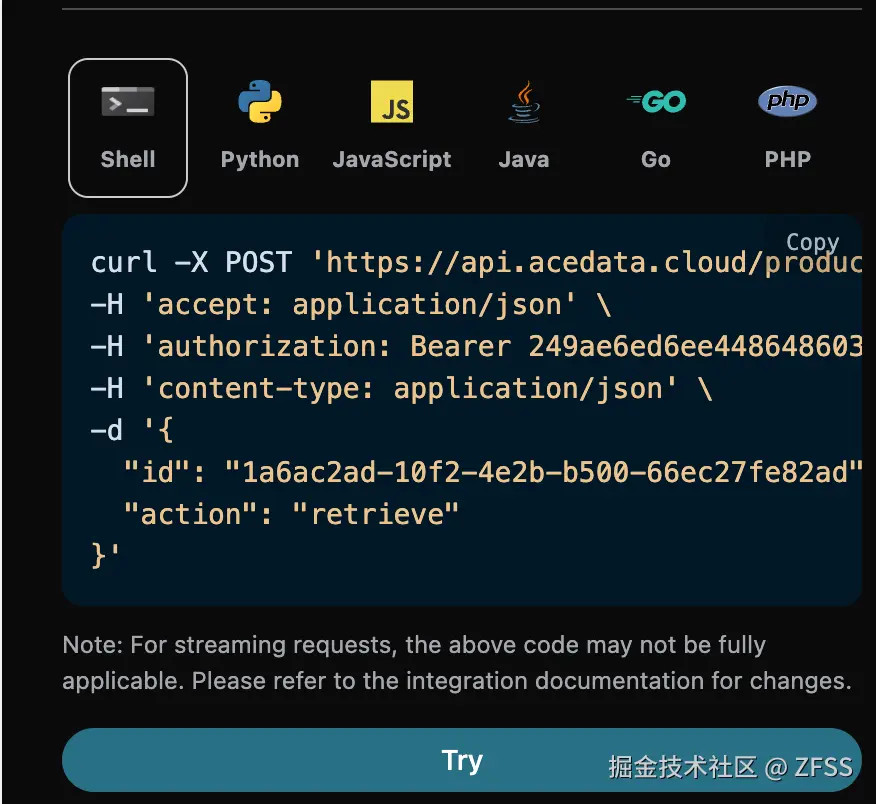 我们以 Producer Audios Generation API 服务返回的任务ID一个为例,演示如何使用该 API。假设我们有一个任务ID:1a6ac2ad-10f2-4e2b-b500-66ec27fe82ad,接下来演示如何通过传入一个任务ID来。