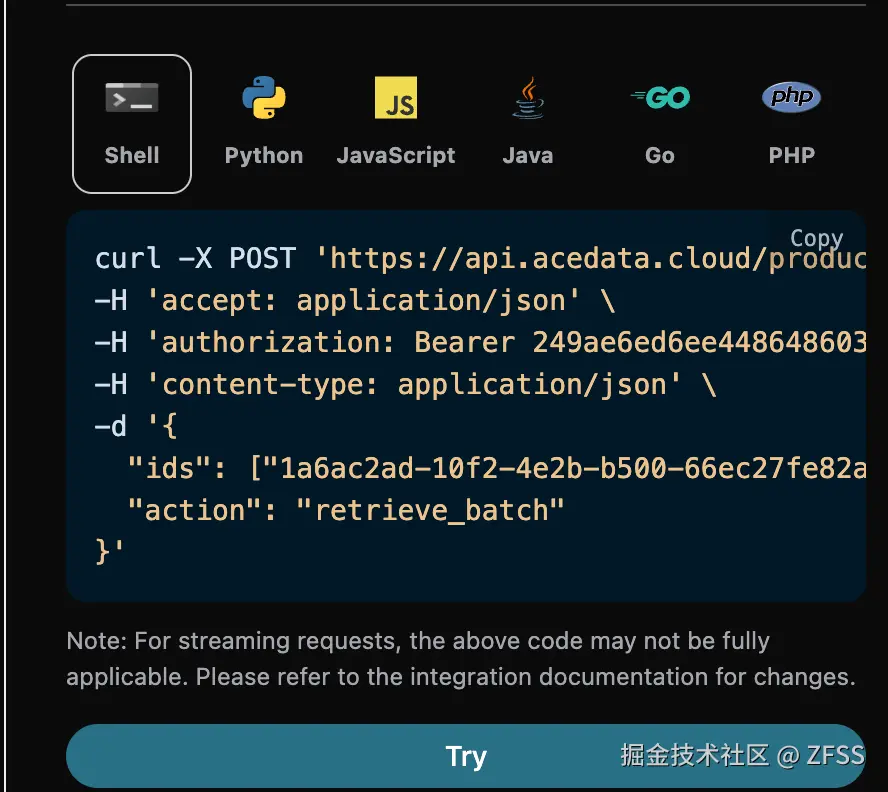 可以发现,在页面右侧已经自动生成了各种语言的代码,如图所示: