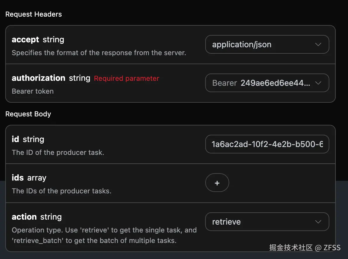 accept:指定接收 JSON 格式的响应结果,这里填写为application/json。authorization:调用 API 的密钥,申请之后可以直接下拉选择。