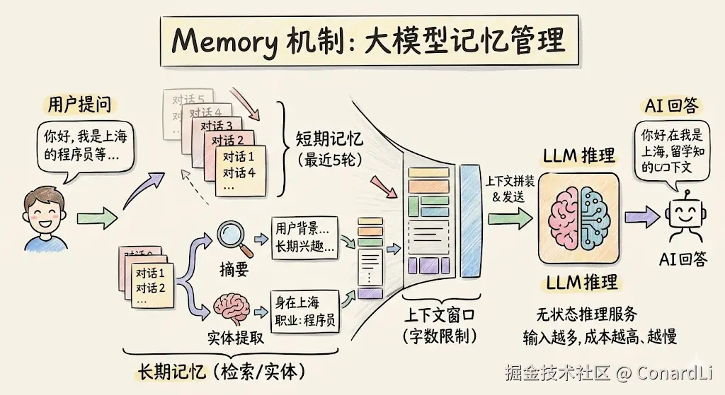 每次用户发起新提问时,系统会先提取并拼装这些记忆片段,再和当前问题一起发送给大模型。