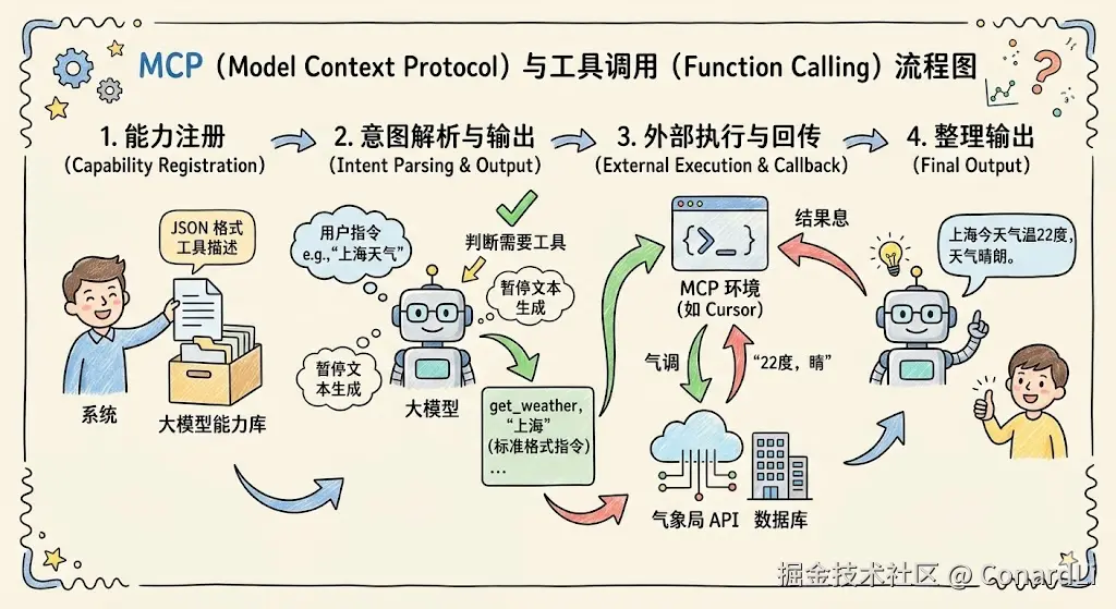有了 Memory 和 RAG,大模型具备了 “内部记忆” 和 “外部知识”,但它依然是一个封闭在服务器里的纯文本处理系统,无法主动执行获取实时天气、读写本地文件、查询数据库等外部操作。