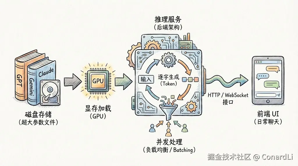 想要让大模型工作,需要一套专门的后端架构将其加载到显存中,对外提供 HTTP 或 WebSocket 接口。