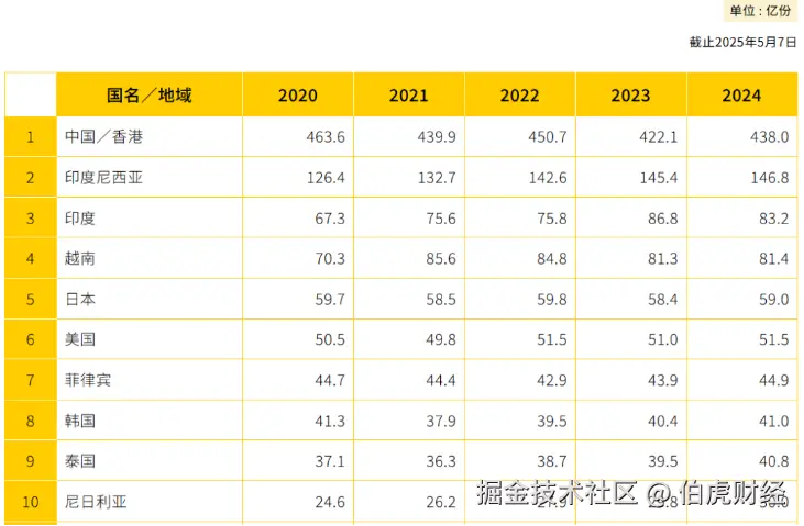 根据世界方便面协会数据,2020-2024年,中国方便面的消费量从463.6亿包跌至2024年的438亿包,减少了约25亿包。