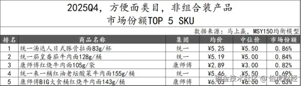 根据“马上赢”数据,康师傅去年共推出367款新品SKU,但康师傅新品在2025年第四季度仅贡献了2.51%的市场份额;白象、今麦郎的新品贡献度更不足1%。