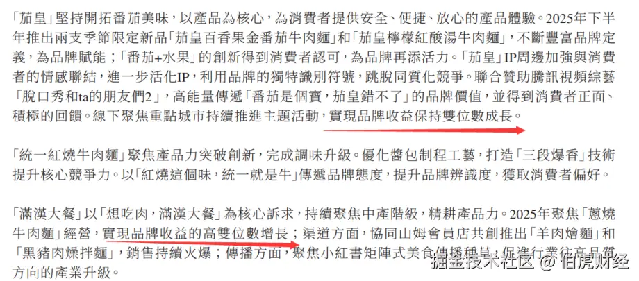 统一在2025年财报中提到,食品业务增长的主要驱动力来自高端产品。其中,“茄皇”和“满汉大餐”两款高端产品的全年收益保持双位数增长。
