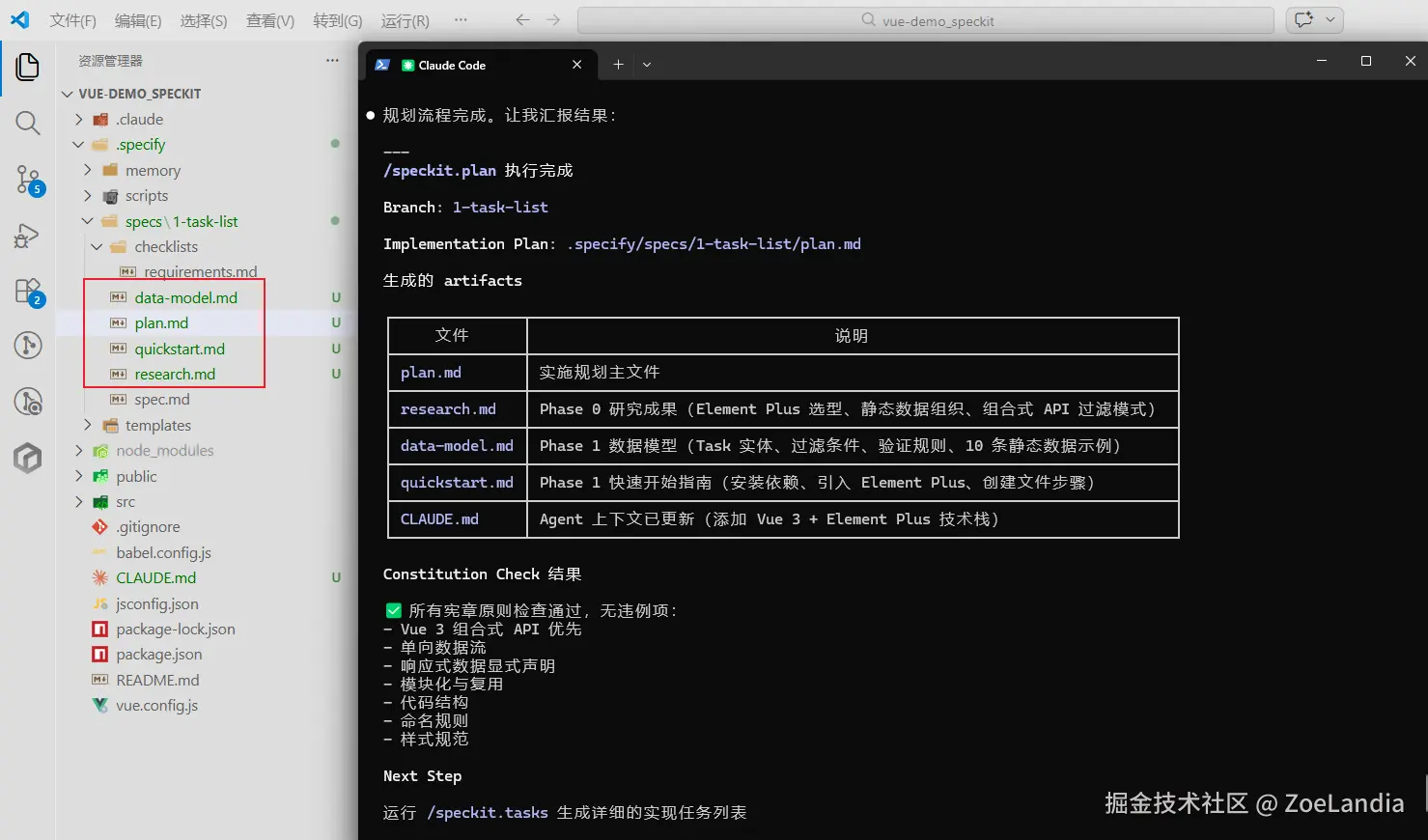 执行完成后多了以下一些产物,基于功能规范,AI 自动生成详细的技术实现计划,包括数据模型、接口契约、外部依赖、性能/安全要求