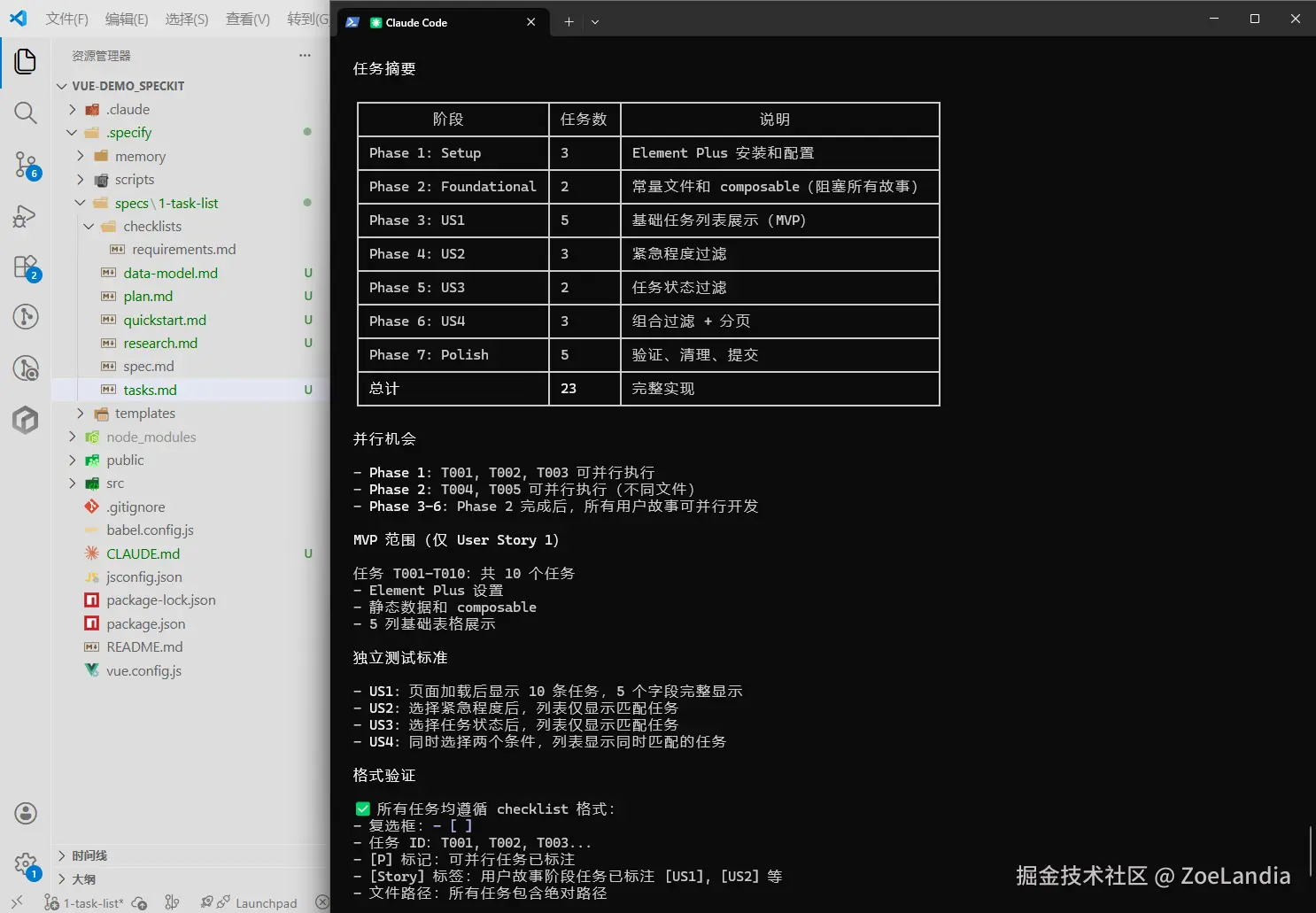 产物是 tasks.md,它将技术方案(Plan)拆解为 AI 和开发者可以一步步执行、可跟踪、可闭环的任务单元,每个任务包含前置条件、执行步骤、依赖关系。