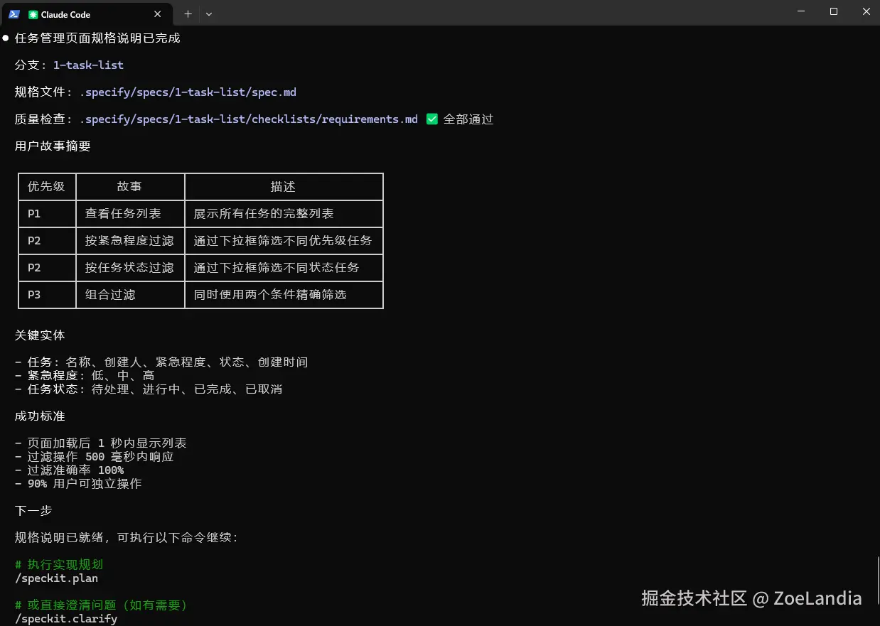 执行完成后,可以看到项目已经新建了 1-task-list 分支,并且已经有了 spec.md 和预生成的 checklist 文件夹。
