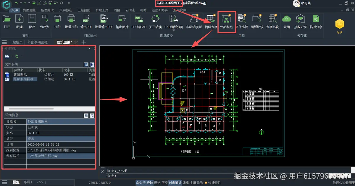 浩辰CAD看图王提供了便捷的外部参照管理功能。电脑版以列表形式显示当前图形文件中的外部参照及相关数据信息,包括参照名称、状态、大小、类型、日期和保存路径。用户可以通过鼠标右键进行打开、附着、拆离、重载、卸载、绑定等操作,极大地方便了外部参照的管理和使用。