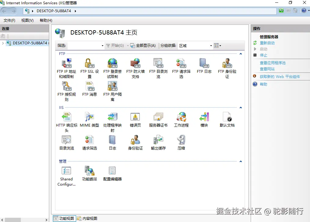 注意现在的这个IIS中并没有安装URL重写模块和 .NET 托管捆绑包;URL重写模块和 .NET 托管捆绑包单出一篇文章。