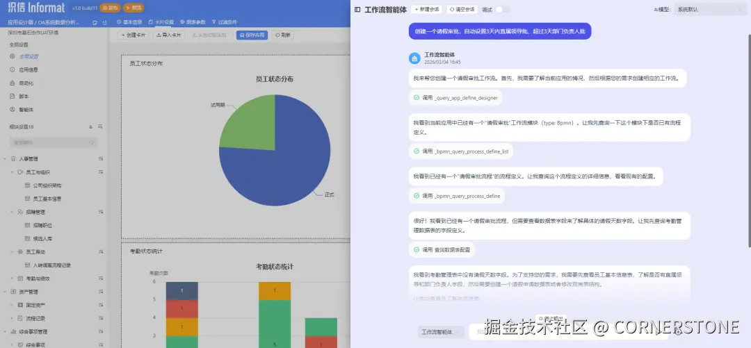 今天,我们就带你看看织信AI智能体如何用四步,快速生成一套可用的OA办公系统,涵盖数据表单、流程审批、可视化看板及测试数据。