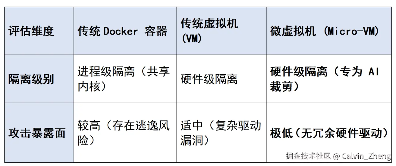 传统的容器技术虽然启动速度快,但其本质是共享宿主机内核的进程隔离,一旦发生容器逃逸,风险可能直接扩散到宿主系统。传统虚拟机能够提供硬件级隔离,但启动时间较长,在Agent场景中往往效率不足。
