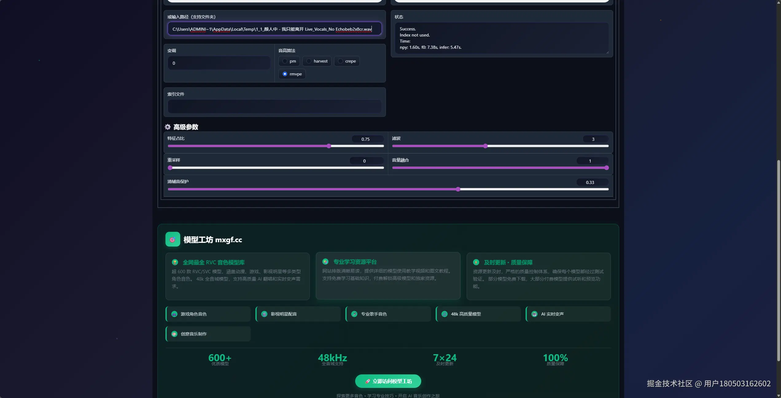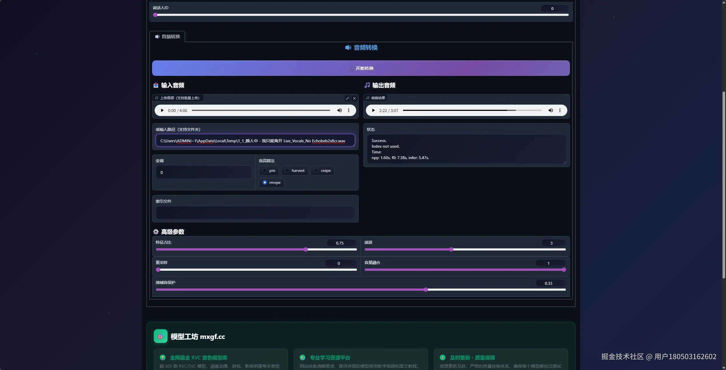 作为 AI 翻唱、实时变声领域的核心工具,RVC WebUI 凭借低门槛、高还原度的优势圈粉无数。如今模型工坊针对其推出二次优化更新,版本号 20260311 正式上线!目前该版本仅支持 20/30/40 系 N 卡,50 系及 AMD 系列显卡的适配工作仍在加紧开发中,后续将逐步开放,敬请期待~