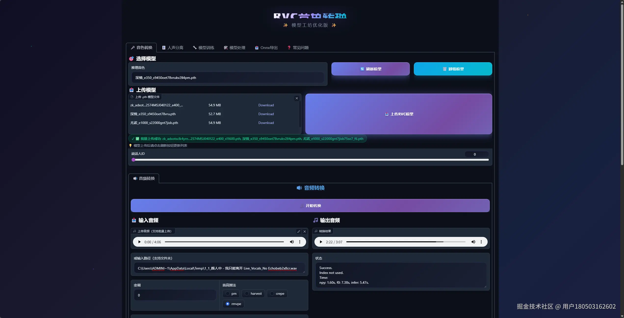 - 模型上传告别手动繁琐操作:旧版本需手动将.pth 模型文件放置到 \assets\weights 文件夹,新版支持直接上传,系统会自动复制至对应路径,加载效率大幅提升;