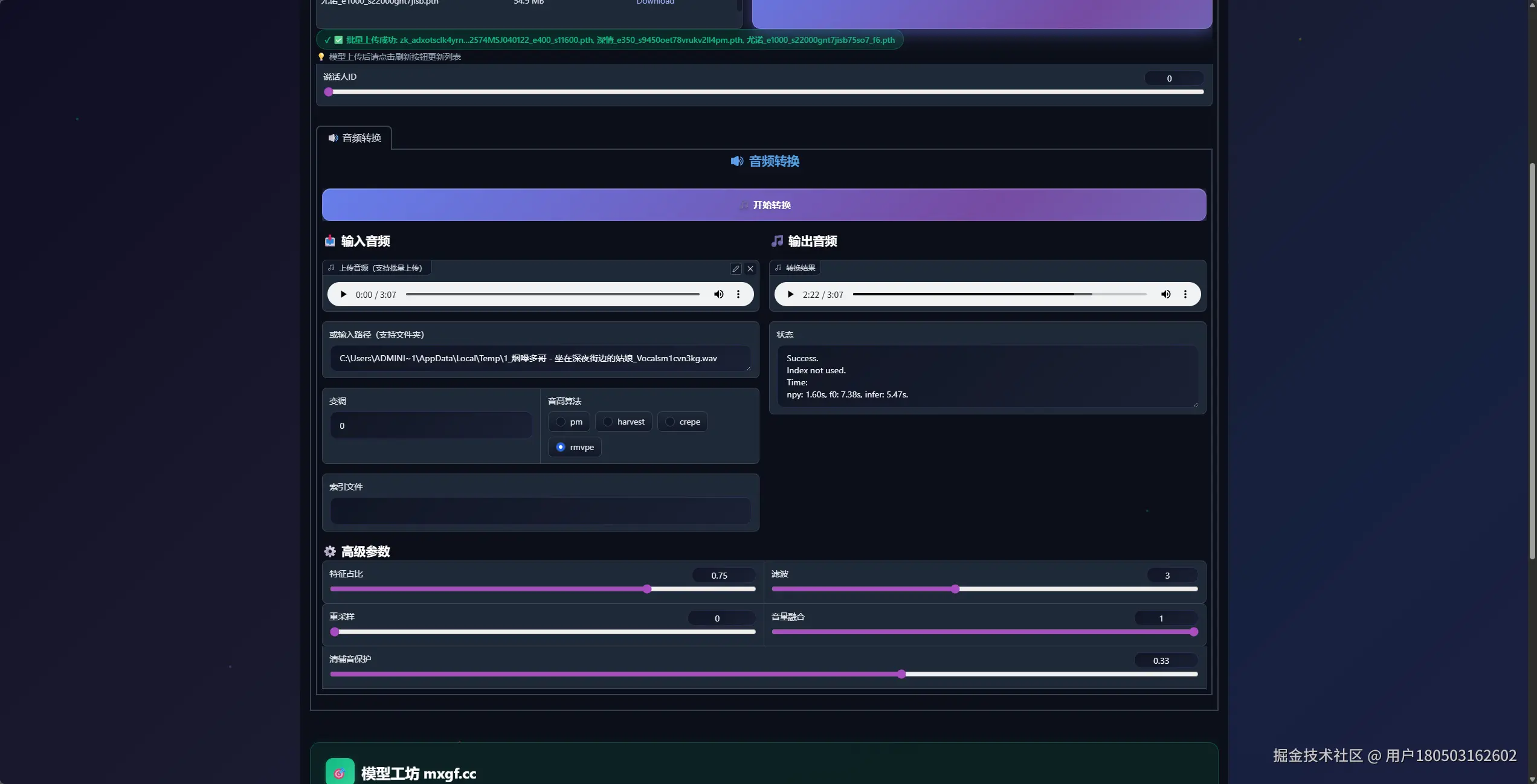 - 歌曲上传无需复制路径:无需手动查找并复制歌曲文件路径,直接拖拽音频即可完成上传,系统自动解析文件地址,更贴心支持转换前后双版本试听,直观对比效果差异;