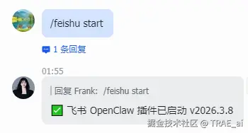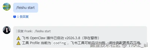 然后在飞书与AI 的对话中发送:/feishu start;如果返回了版本号信息,则代表安装成功