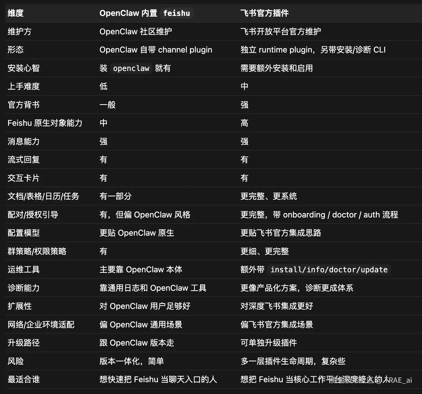 飞书官方插件,能以用户身份读写消息、文档等,支持更多功能,体验更丝滑。以下为OpenClaw内置飞书功能和飞书官方插件的对比,供参考,可以看出来,如果你期望在飞书上“养虾”,飞书的官方插件更完整和系统。