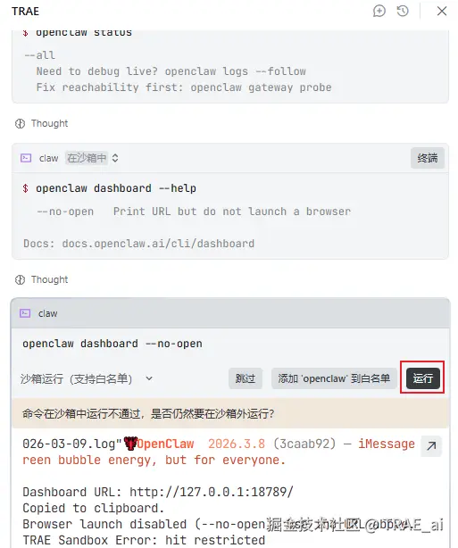 在这个过程中,也有部分命令需要手工确认。你可以关注 TRAE 里的提示信息并确认执行完毕。