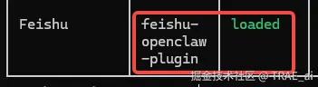 我们可以看到 ID 为「feishu-OpenClaw-plugin」的 Status 为 loaded ,如何 ID 为 feishu 的 Status 为 disabled 则表示已成功启用飞书官方插件。