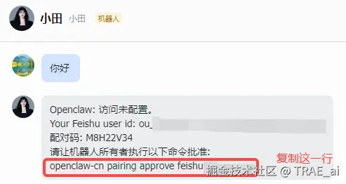 打开你的飞书,搜索机器人并发送任意消息(比如 你好 ),会收到类似这样的消息。收到这个消息说明飞书的消息已经成功被 OpenClaw 接收到了。当前需要执行一下配对操作,以确认当前用户的管理员身份。