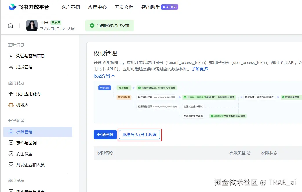 找到「开发配置」—>「权限管理」,点击「批量导入/导出权限」