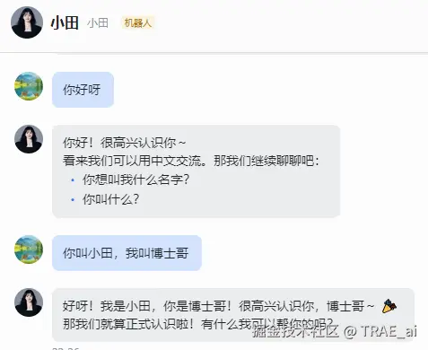 TRAE 执行完成后,回到飞书的机器人对话里,再次发消息,就会收到类似这样的的回复。恭喜你,你的虾成功上线啦。给你的龙虾取个好听的名字吧~