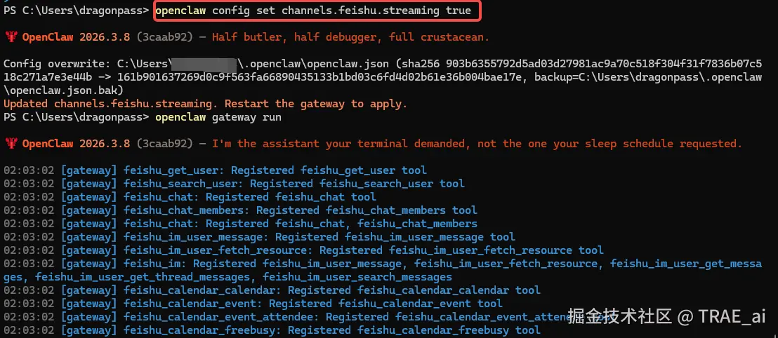 OpenClaw config set channels.feishu.streaming true
