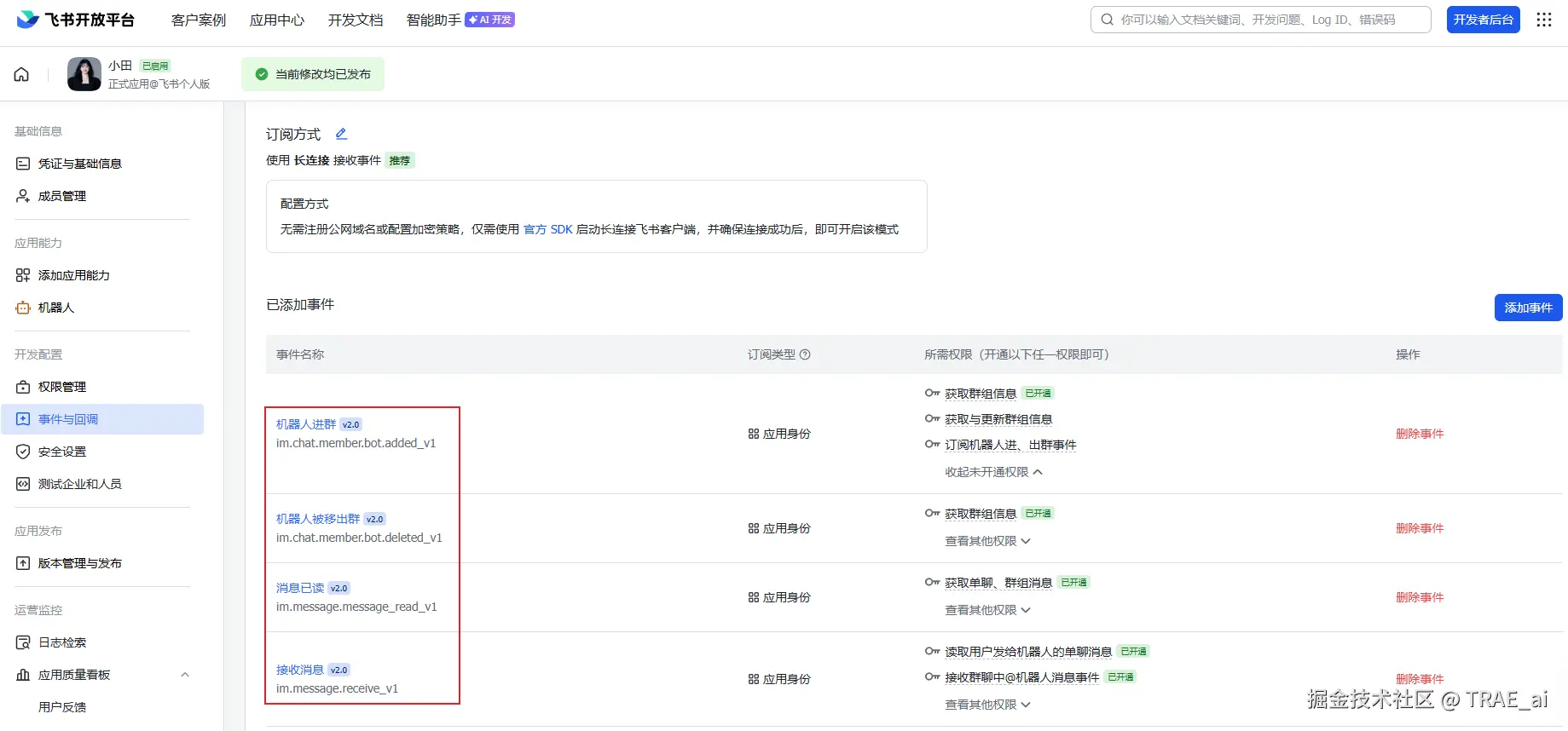 - 在「事件与回调」中设置「事件配置」订阅方式为「长连接」,并添加「接收消息」订阅事件。