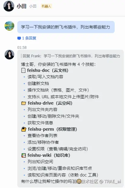 为了让你的“小龙虾”能学会这些新技能并正确使用,请和龙虾说“学习一下我安装的新飞书插件,列出有哪些能力”