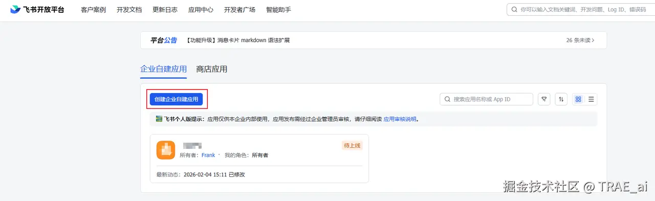 访问飞书开发者后台 open.feishu.cn/app,创建企业自建应…