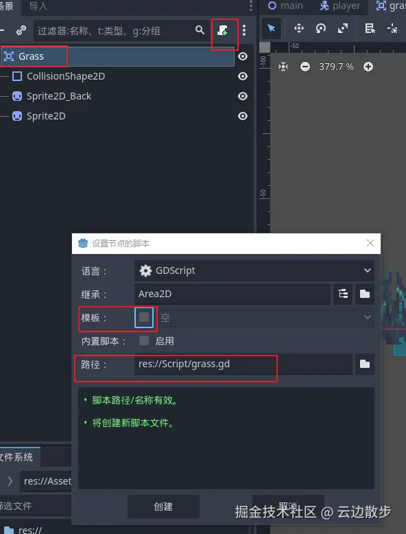 - 我们来到草丛场景点击根节点点击卷轴图标创建脚本代码,并且保存在代码文件夹中,然后模版取消勾选就好了