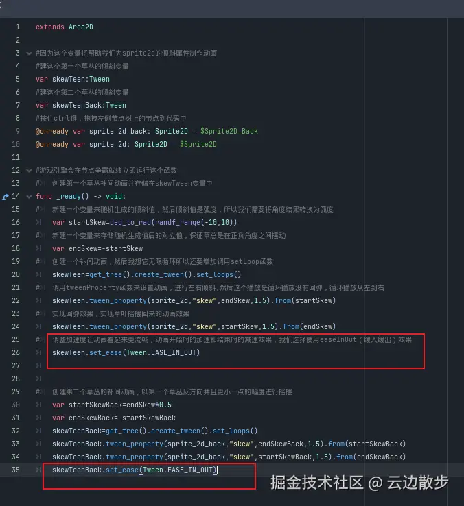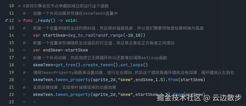 - 然后我们来先搞定第一个草丛的补间动画也就是摇摆动画,我们利用引擎自带的初始化运行函数,然后来设置生成草丛摇摆的弧度,然后进行播放调整。具体的可以看看注释