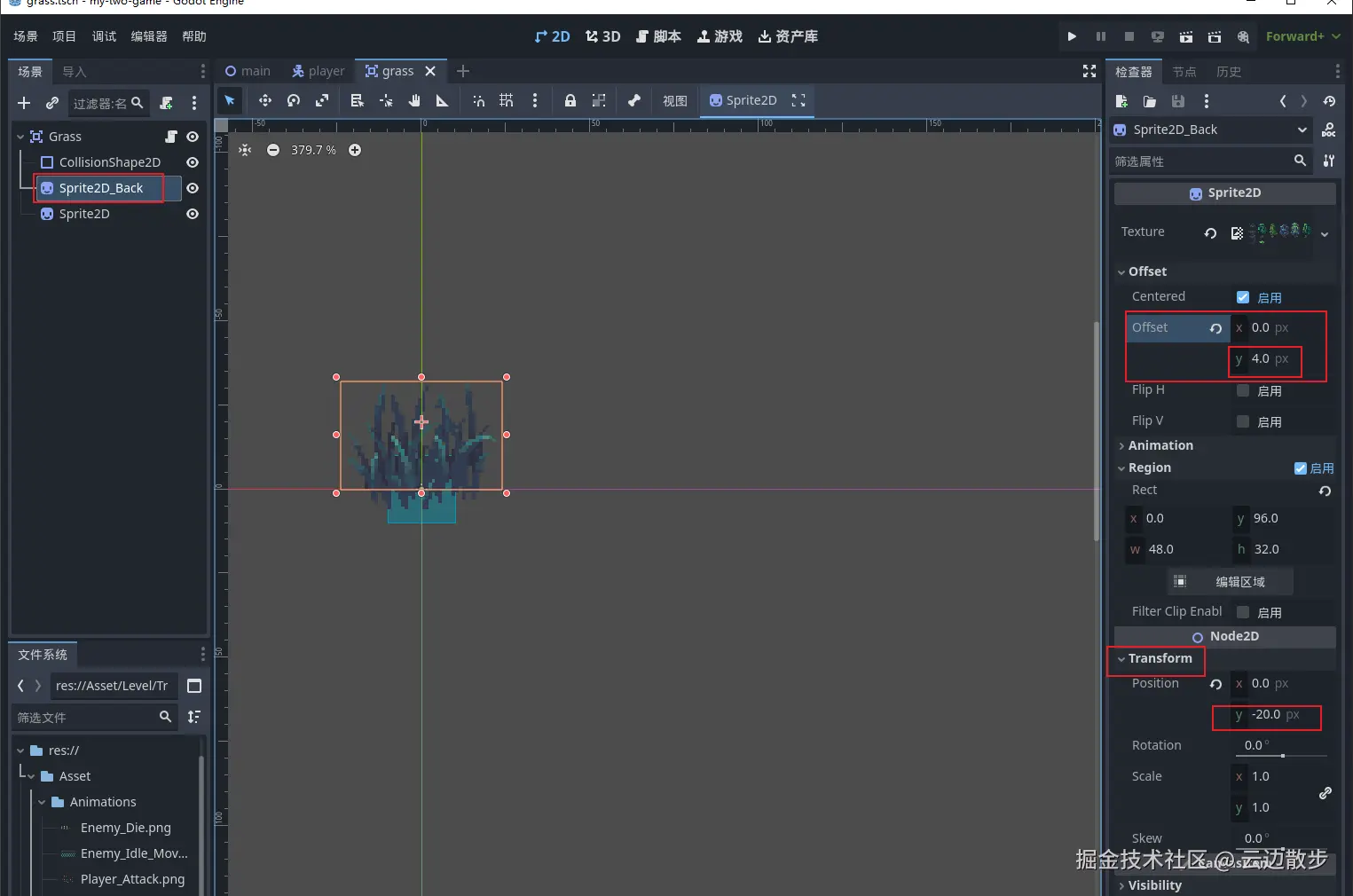 - 然后我们来给2个草丛做一点区别,让前草丛和后草丛看起来像是具有不同y轴排序的不同物体。我们修改后面那个草丛把它的节点坐标往上移动20px,然后偏移量为y轴的4px
