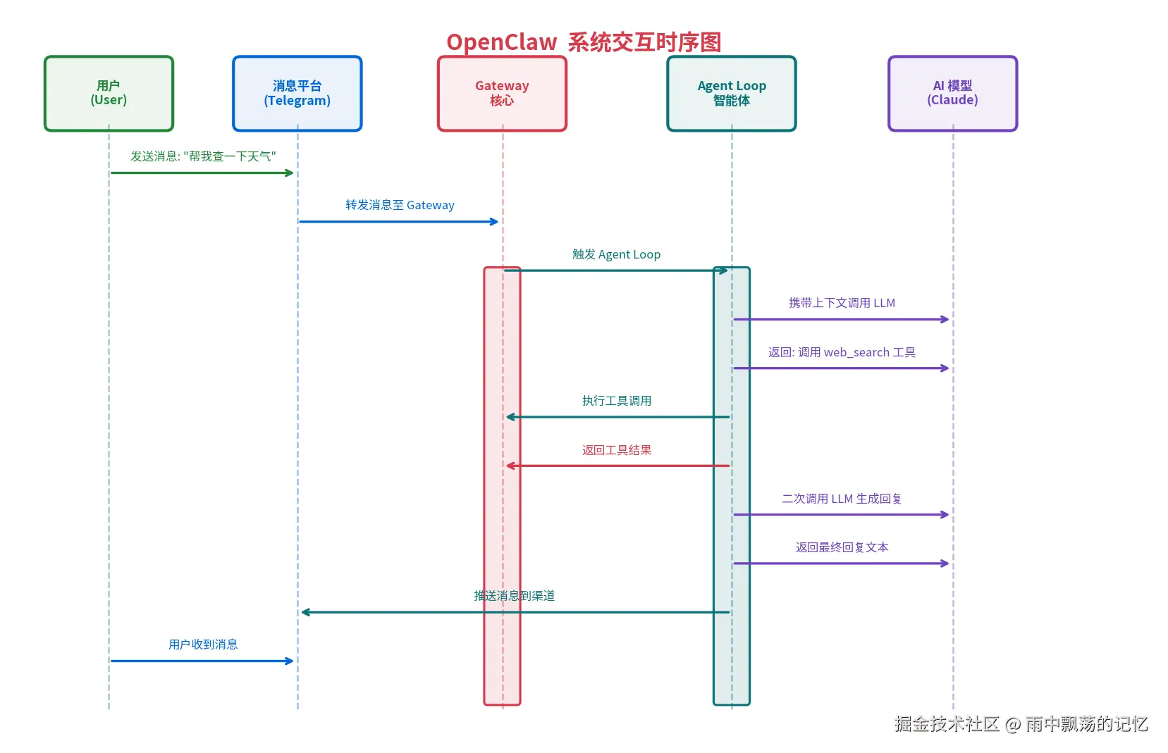 以用户在 Telegram 发送"帮我查一下今天的天气"为例,完整链路如下:
