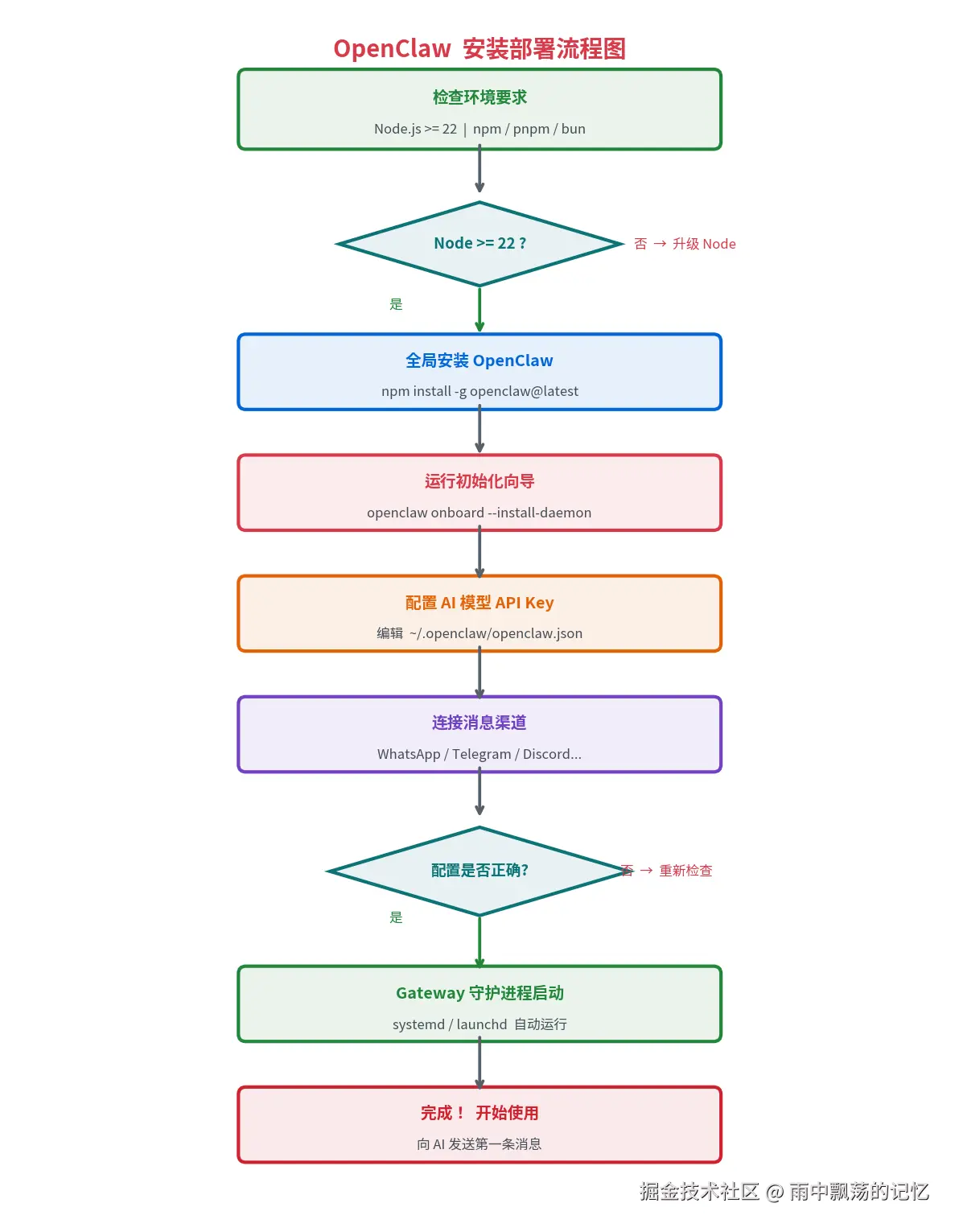 用一句话概括:OpenClaw = 大模型 + 工具调用 + 消息渠道接入 + 持久化守护进程。