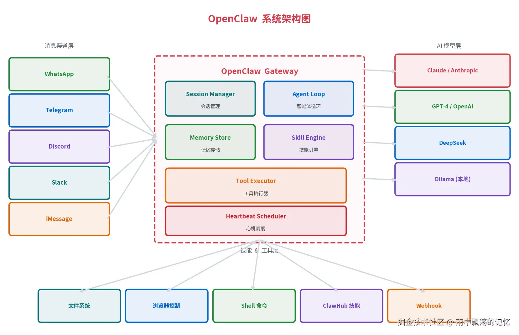 OpenClaw 采用清晰的三层架构设计: