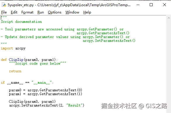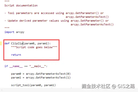 在执行选项卡的代码框中,将 def script_tool(param0, param1): 一行编辑为 def ClipZip(param0, param1):在此处对其进行更改: