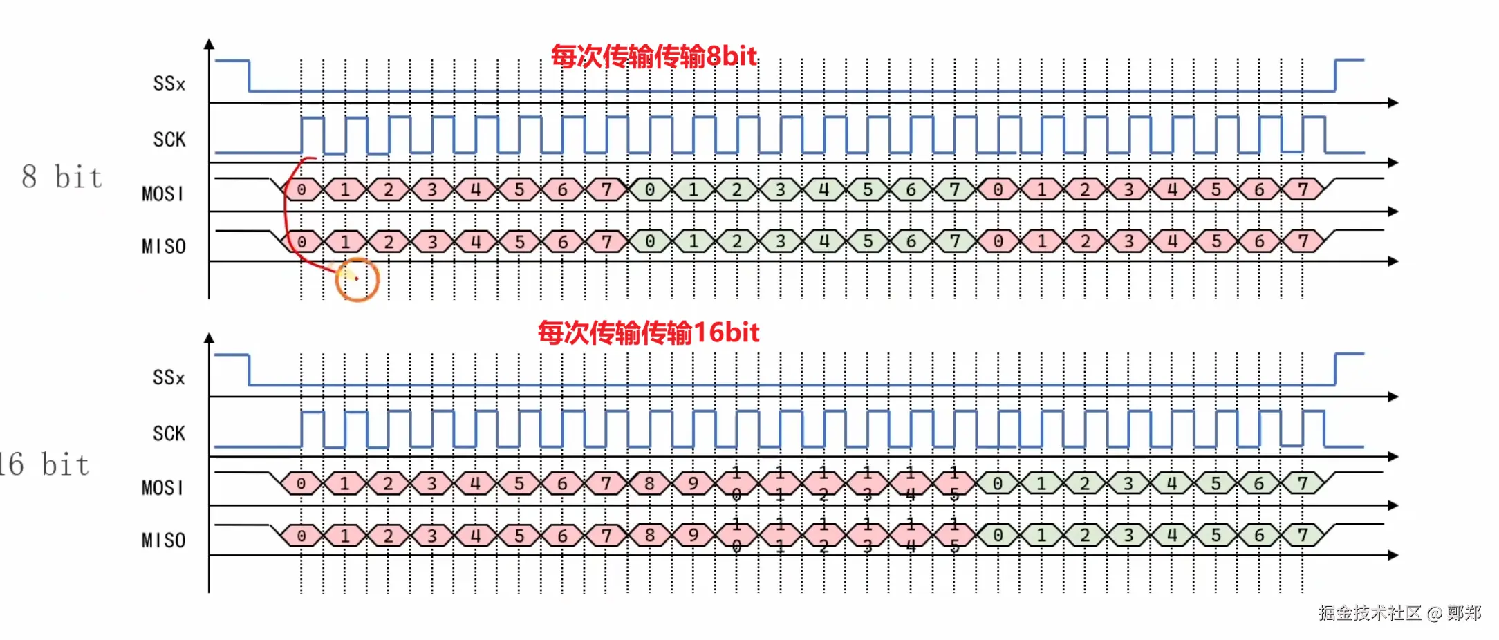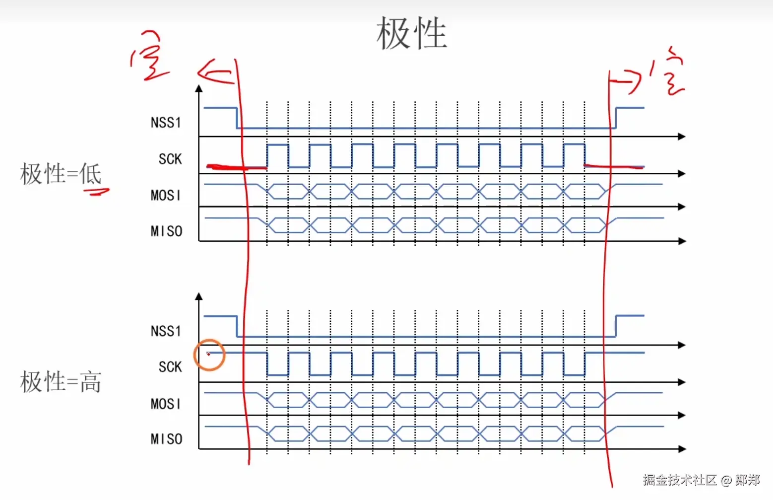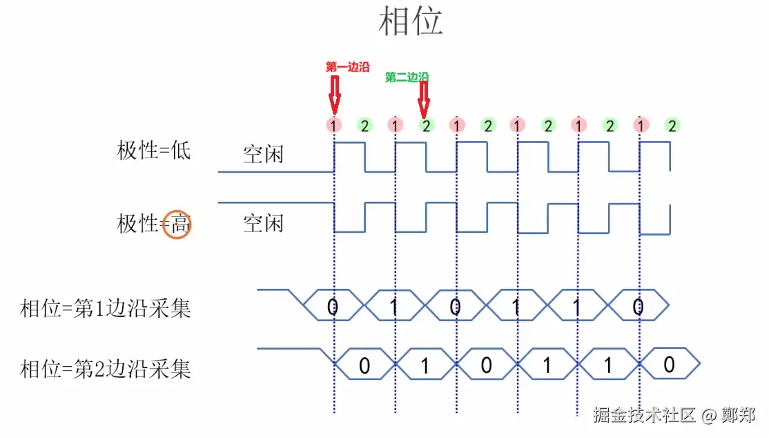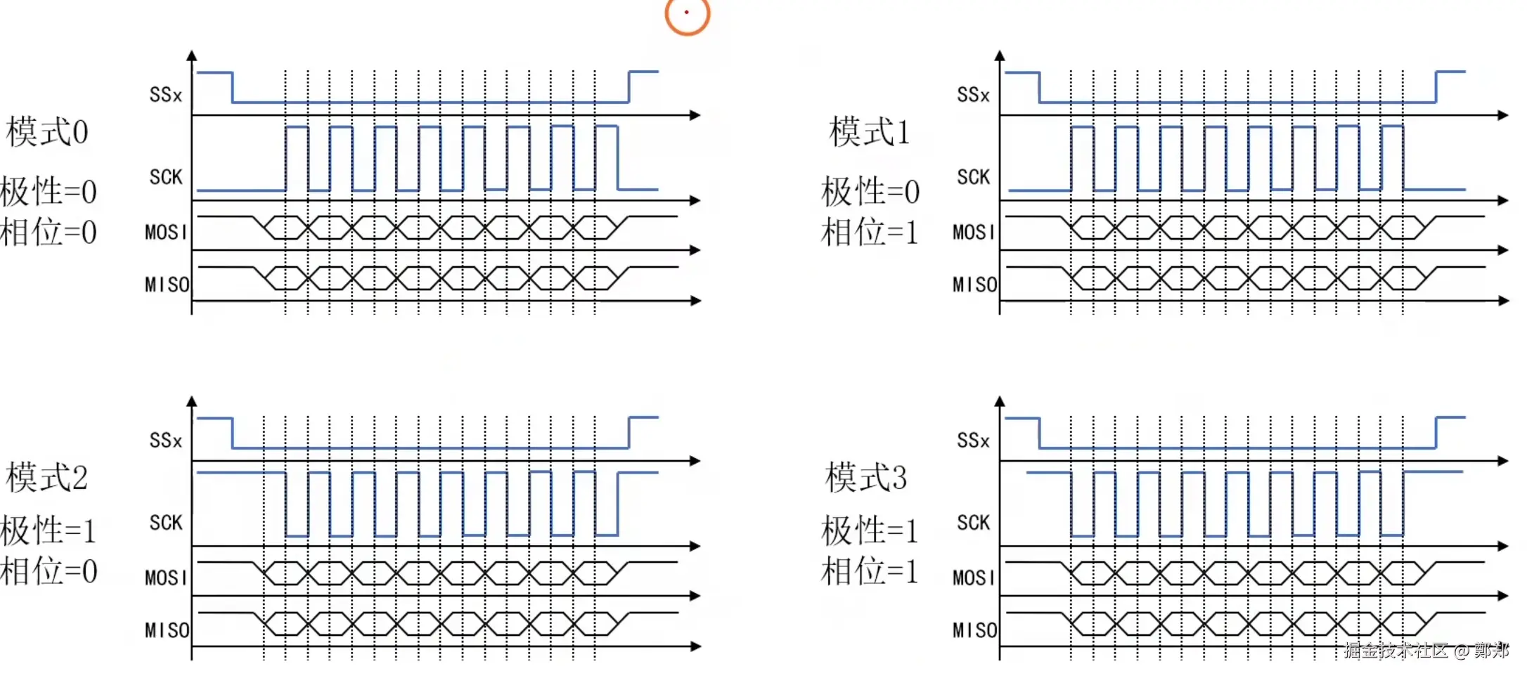 STM32学习笔记--SPI电路结构和通信协议(2026.2.3) 鄭郑 2026-03-11 16 阅读1分钟 一、SPI电路结构 主机与从机1通信时,主机与从机1链接NSS的普通IO输出低电压,其余的输出高电压 二、通信波形 三、极性与相位 空闲状态是高电压-->高极性 空闲状态是低电压-->低极性 四、SPI的四种时钟模式: 五、比特位传输顺序: 六、数据宽度: