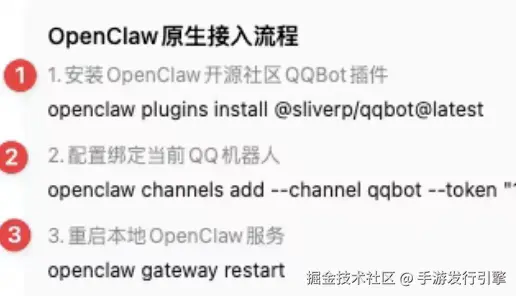 但最重要的是,下面还直接提供了接入流程123。(如果你是最新版本的小龙虾,在选择Channel的步骤里面已经内置了QQ的选择,直接选择然后按引导填入Key和Scret就行,不需要再执行以下命令)