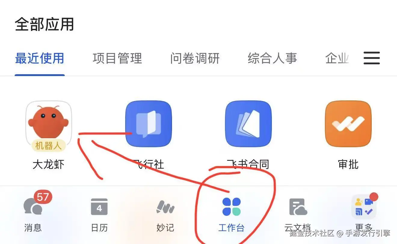 接下来在手机飞书底部菜单栏->工作台即可看到该机器人。点击聊天即可。