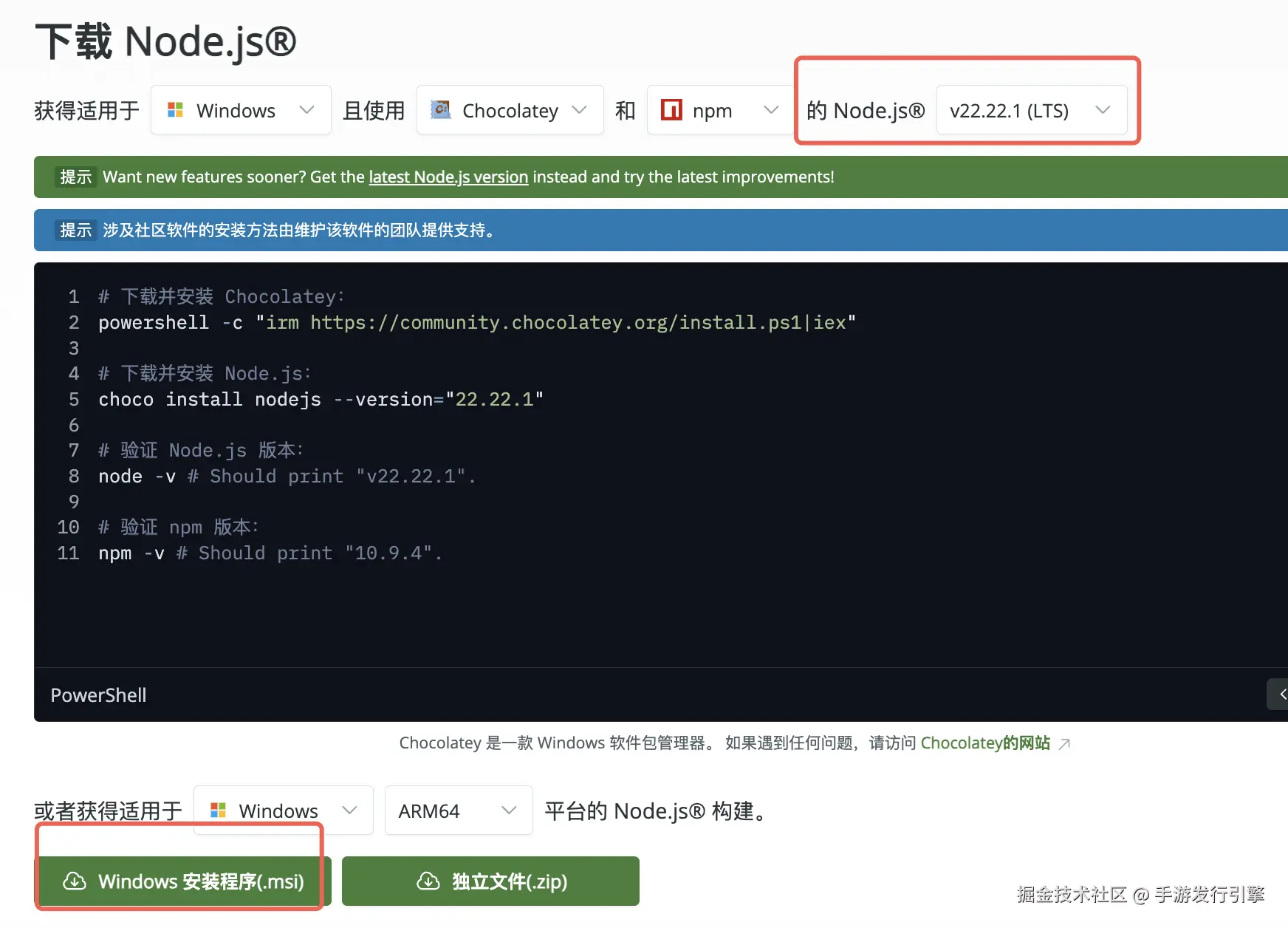 - 安装NodeJS:Node.js — 下载 Node.js®使用官网安装包,选择.msi的安装包,会自动设置环境变量,比命令行更靠谱些。安装选择v22版本!!!(默认v24版本不太顺利)