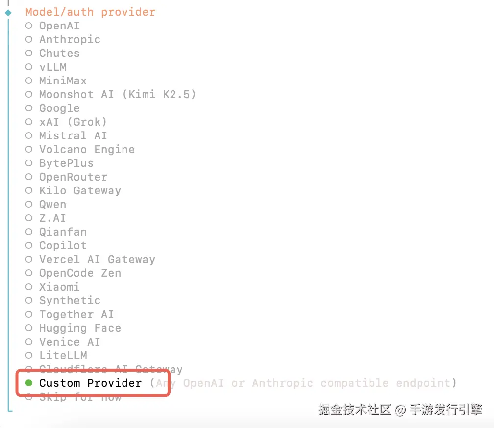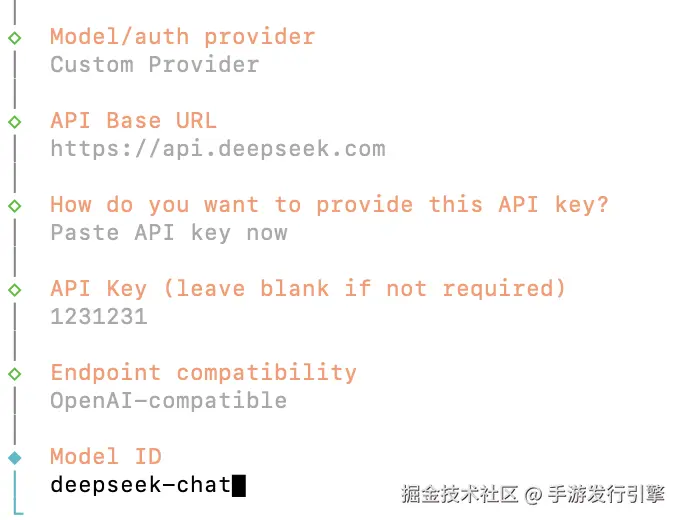 | Deepseek | platform.deepseek.com/ | Deepseek默认没在列表,请按以下方式配置:Model/auth provider选Custom Provider◇ API Base URL填:api.deepseek.com◇ API Key (leave blank if not required)填写你的密钥◇ Endpoint compatibility选:OpenAI-compatible◆ Model ID填:deepseek-chat剩下的都无所谓了 |