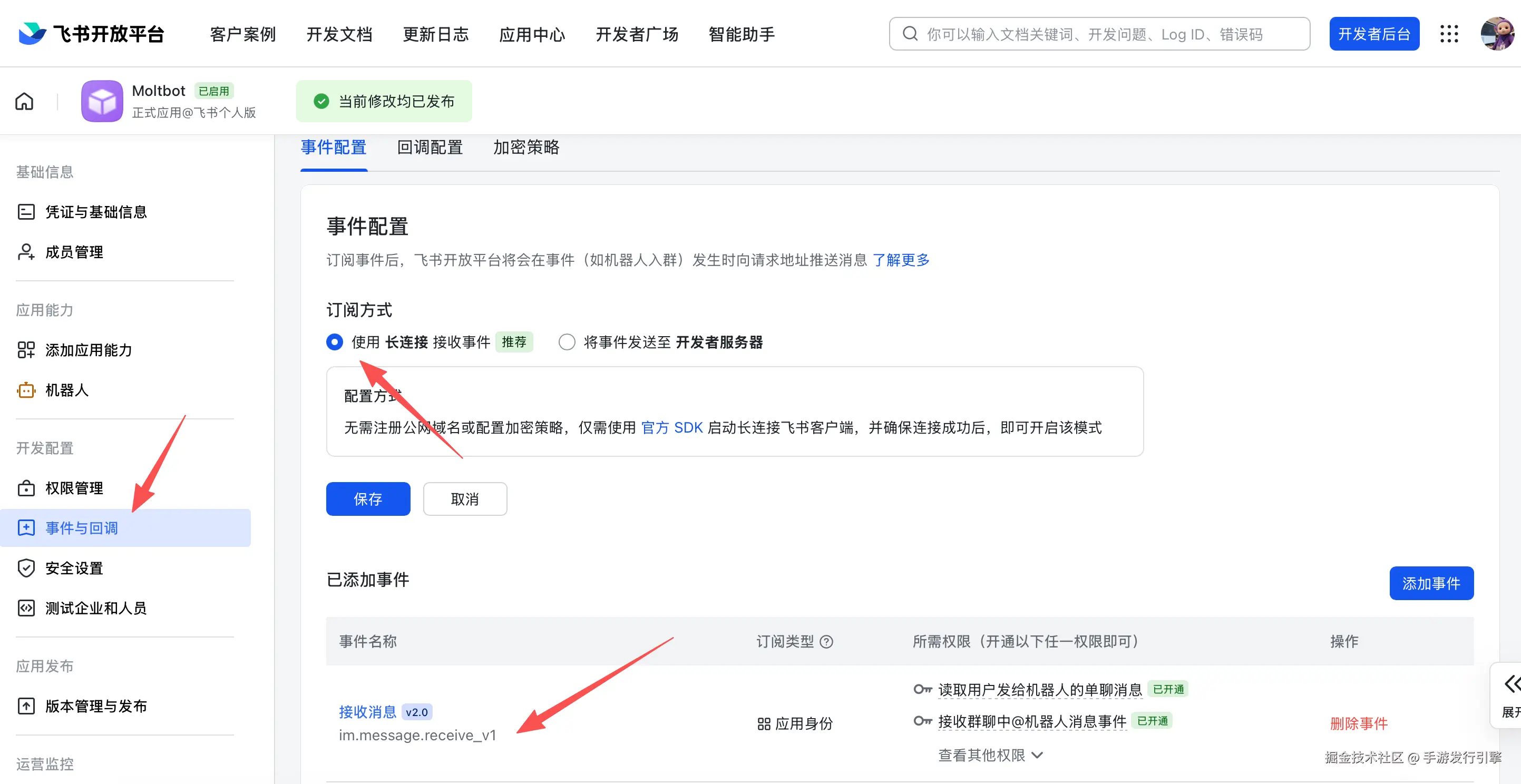 回到飞书开放平台的网页端,在 事件订阅 页面: