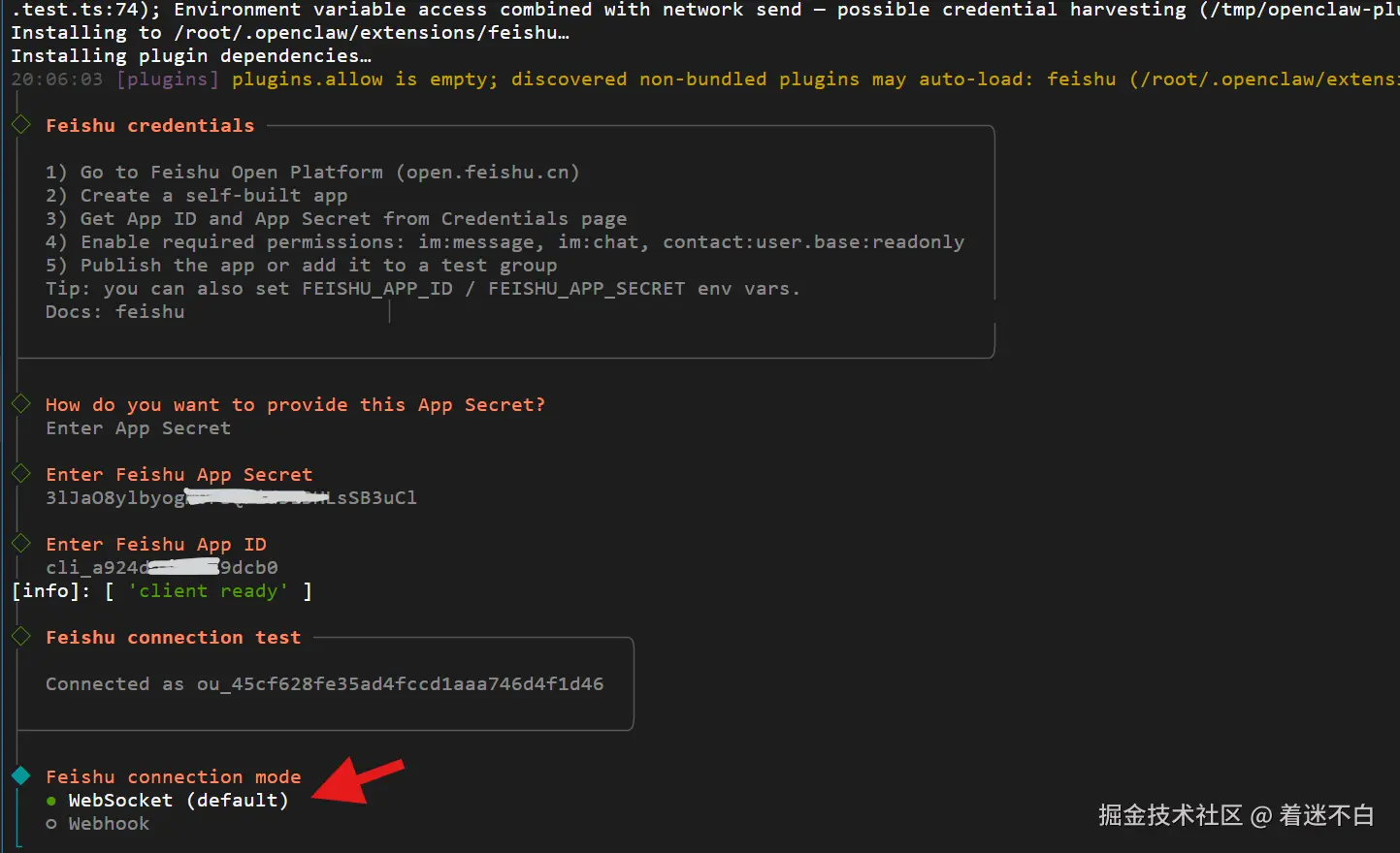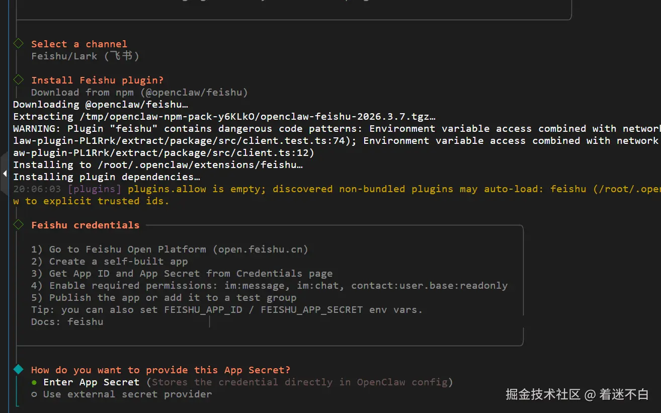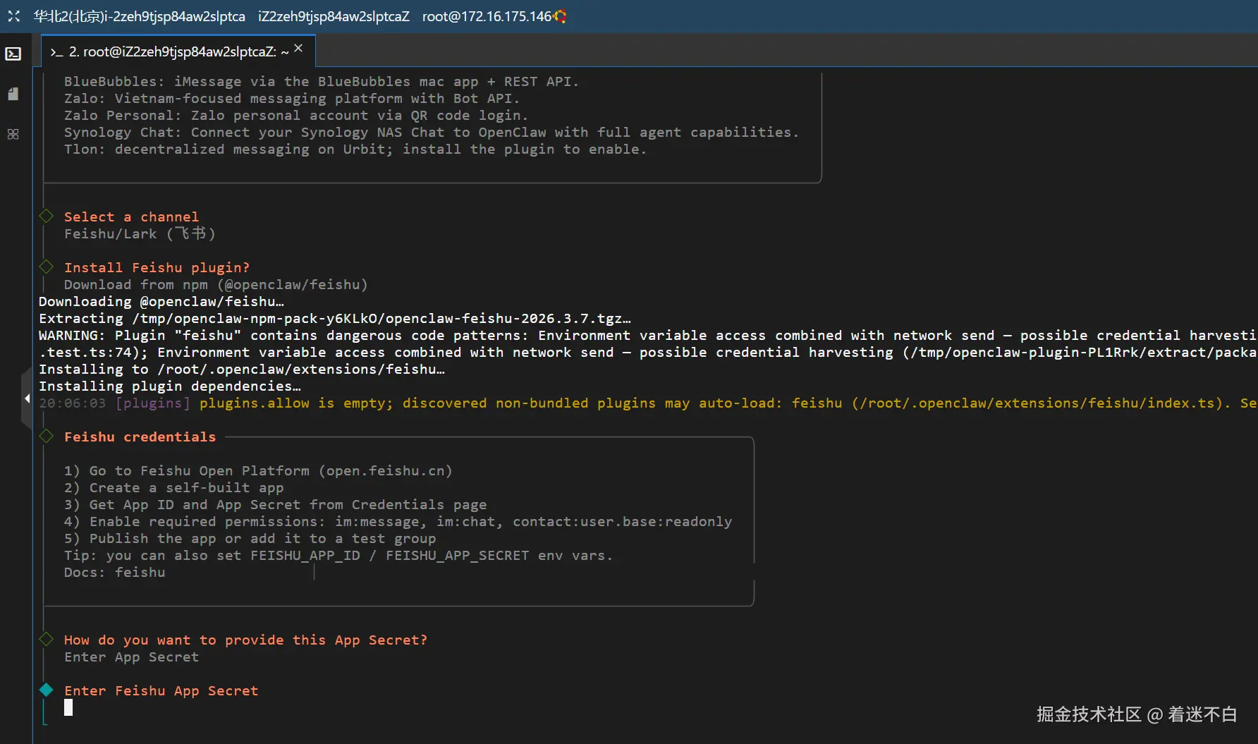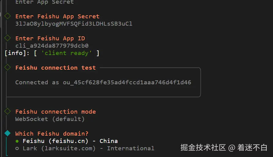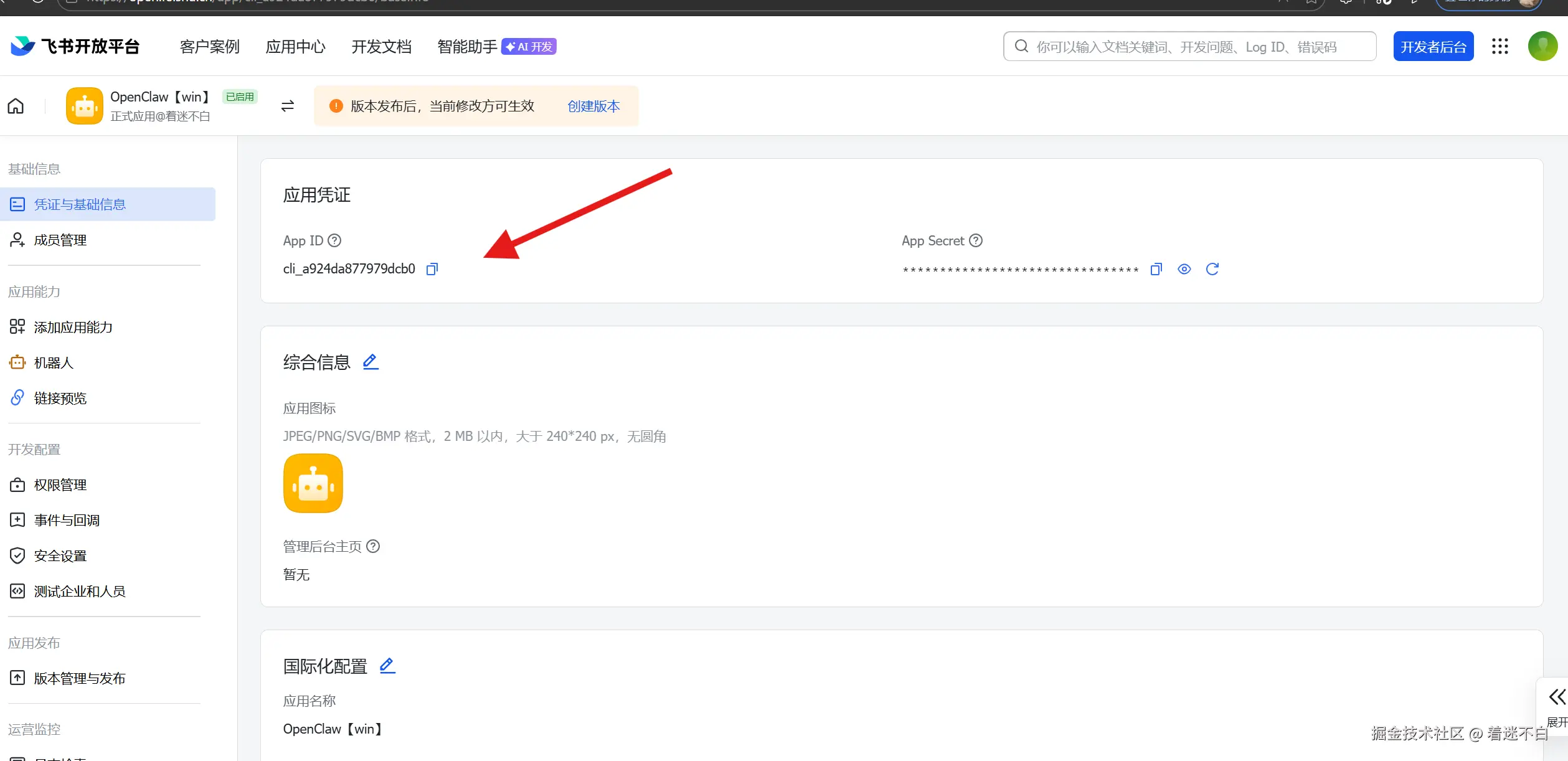 这里提示要输入 APP Secret ,我们去飞书开放平台复制