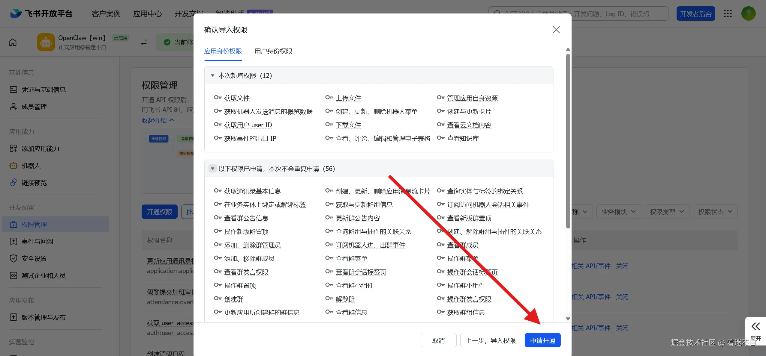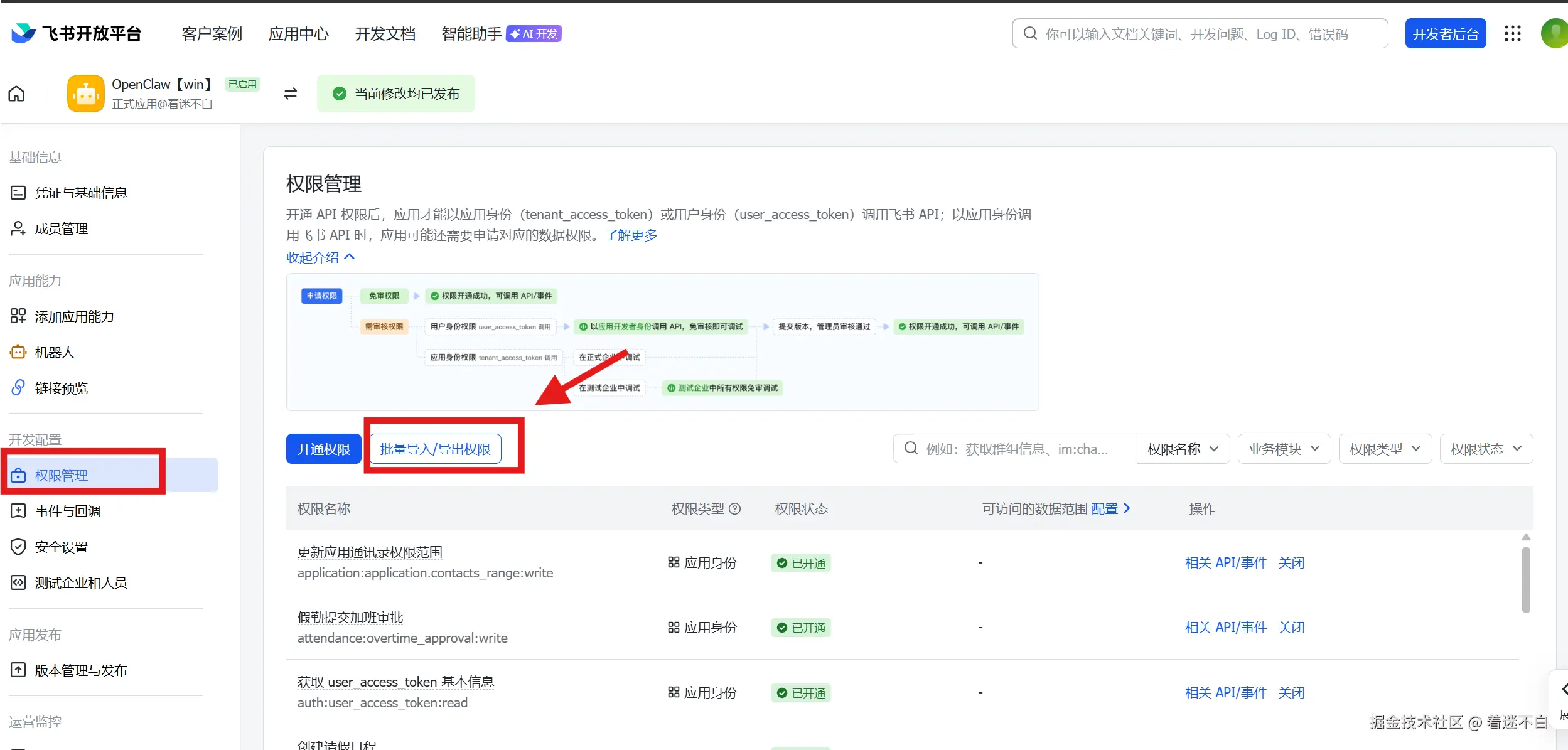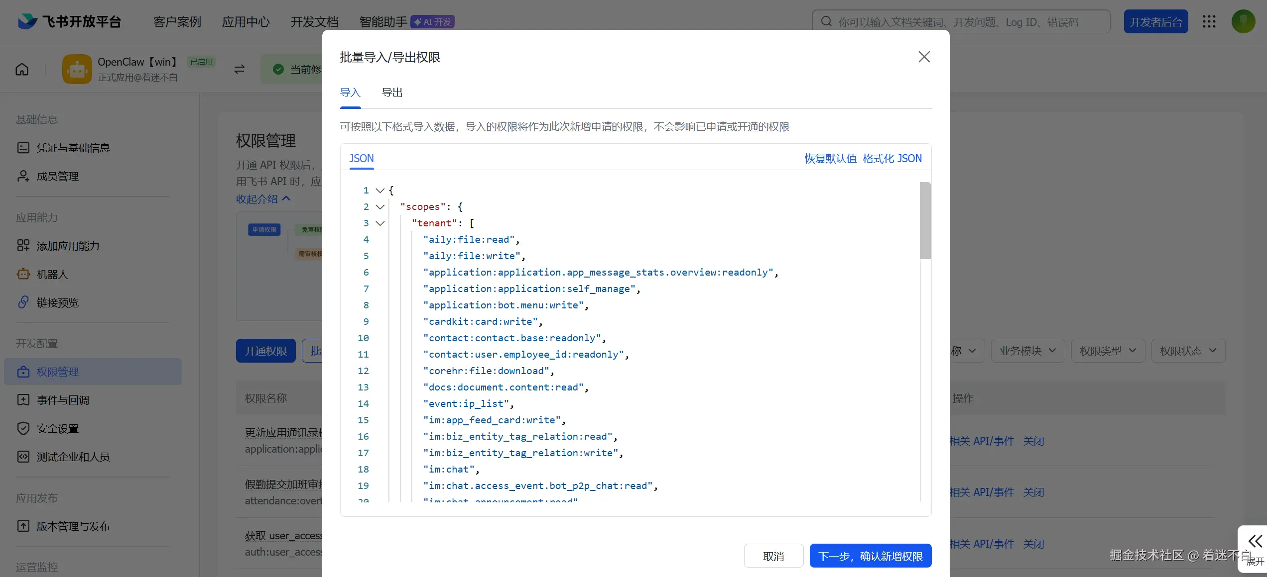 - 点击「导入权限」,粘贴以下 JSON 权限配置(可按需精简):