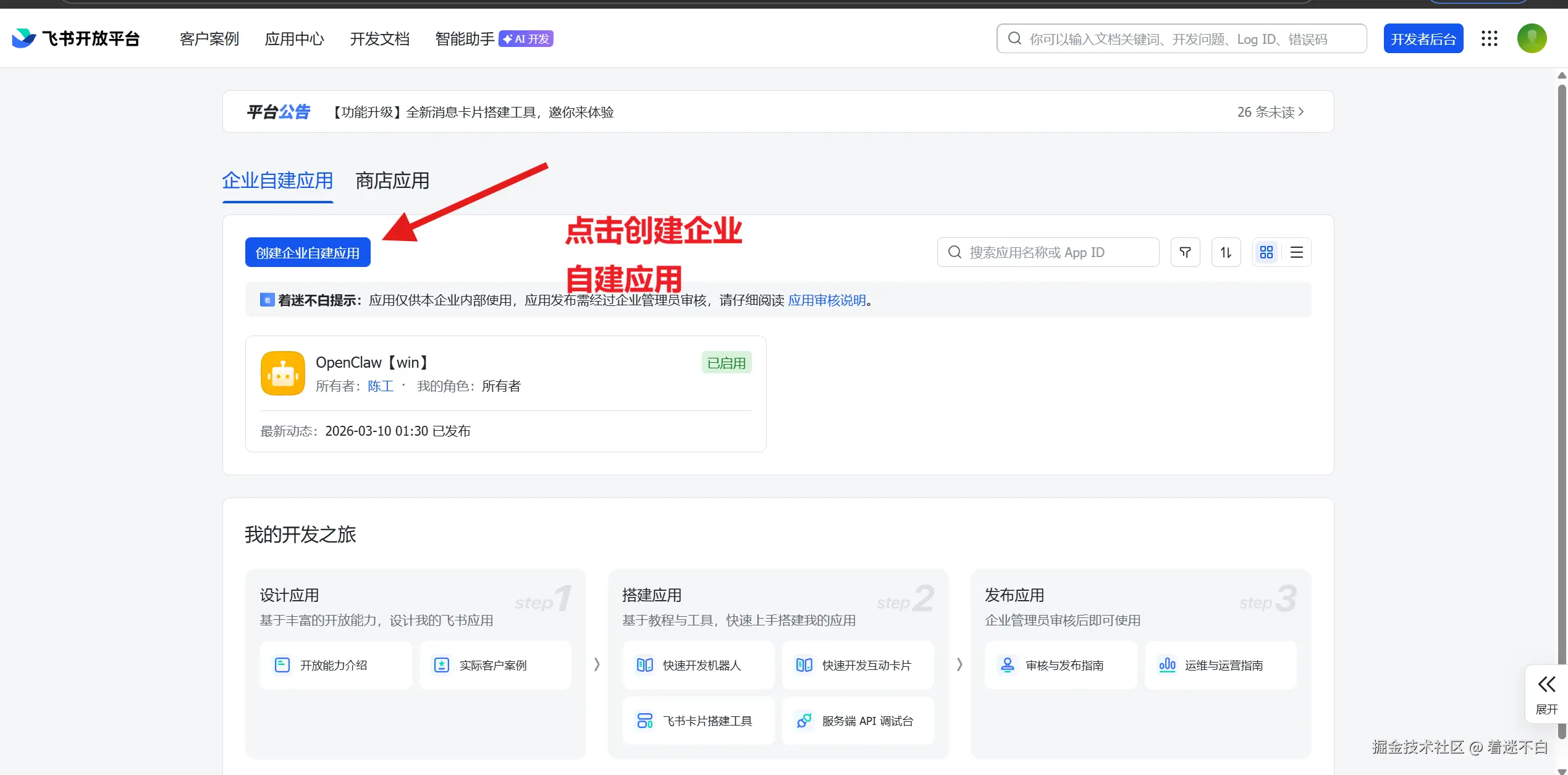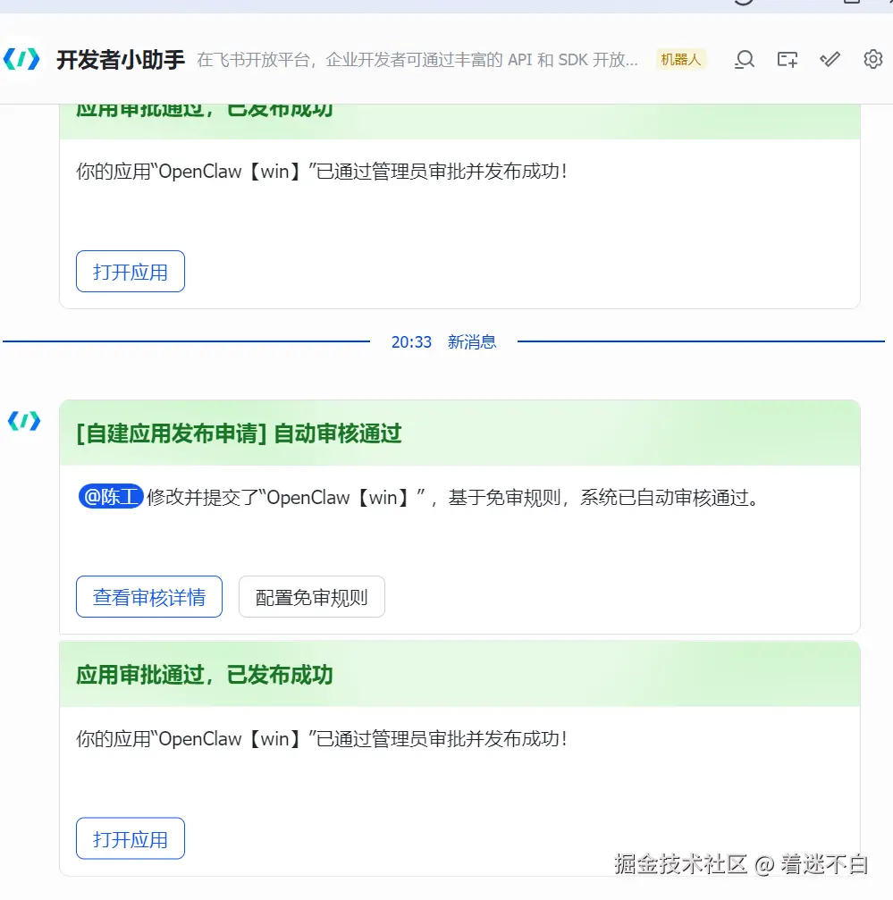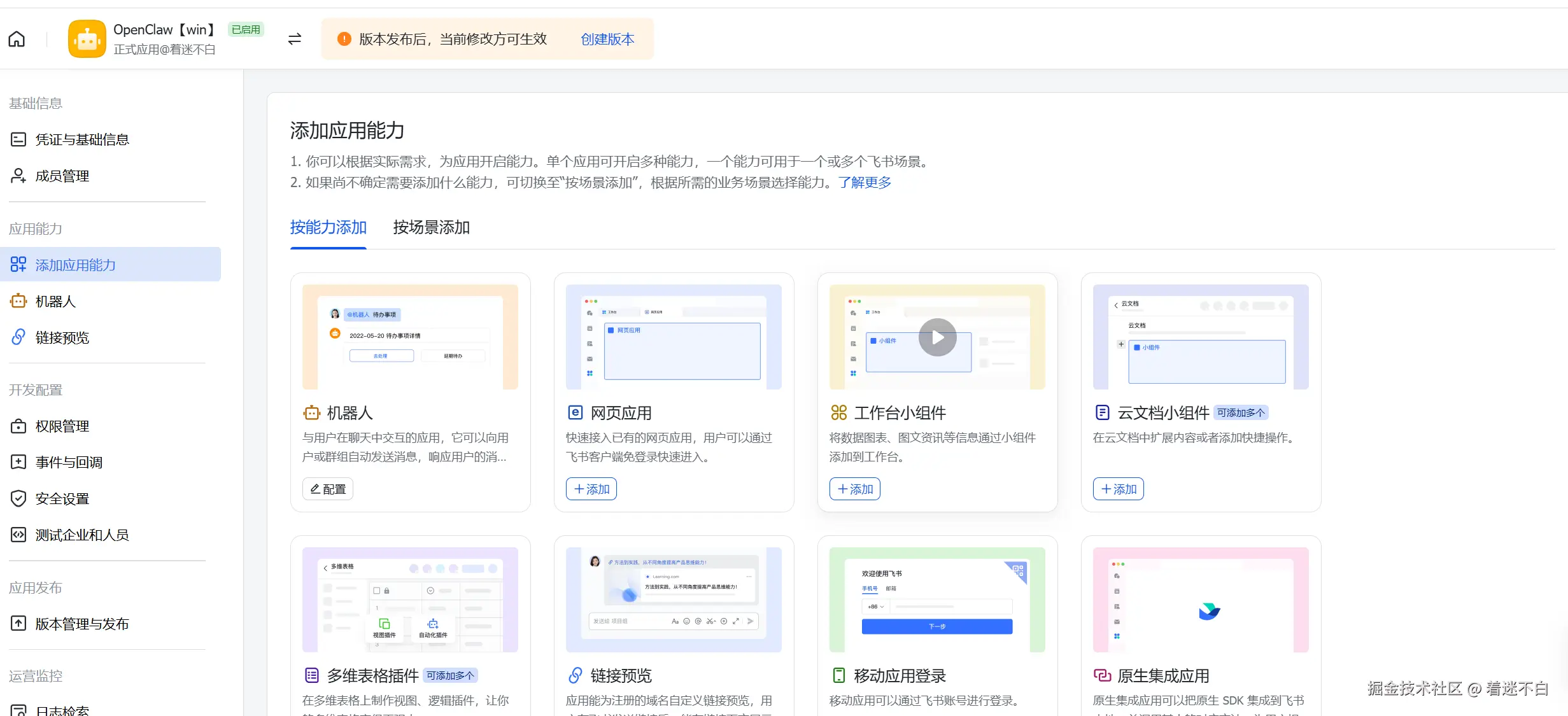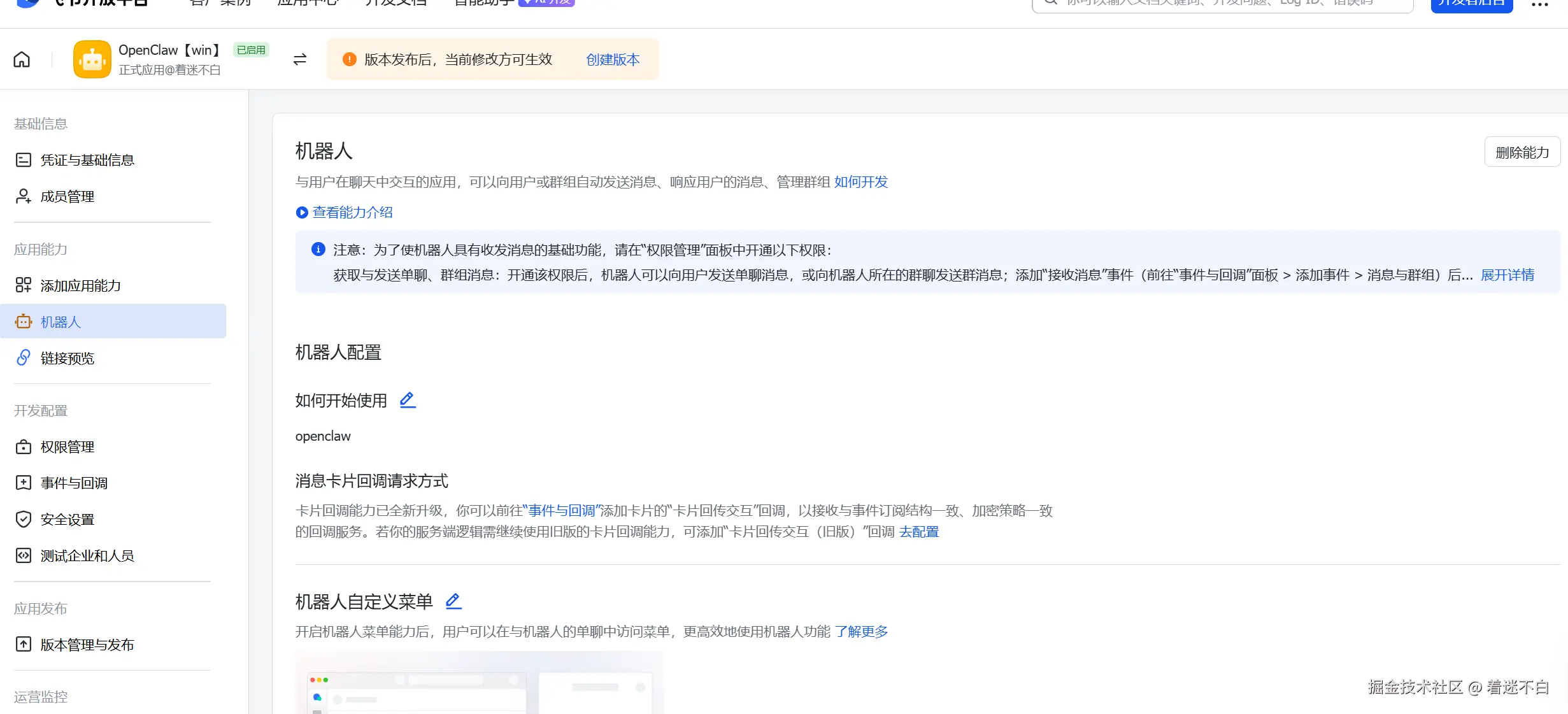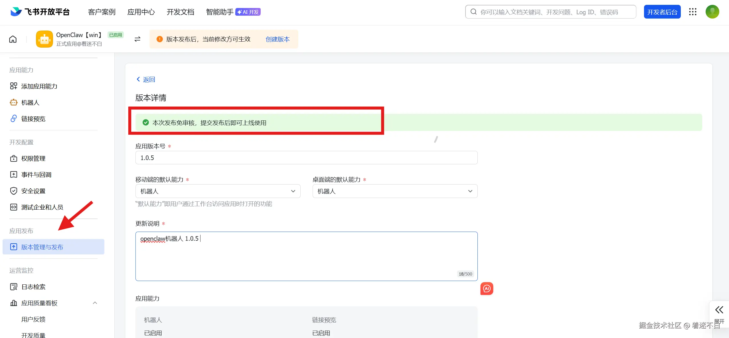 - 创建版本,提交审核(企业自建应用通常自动通过)