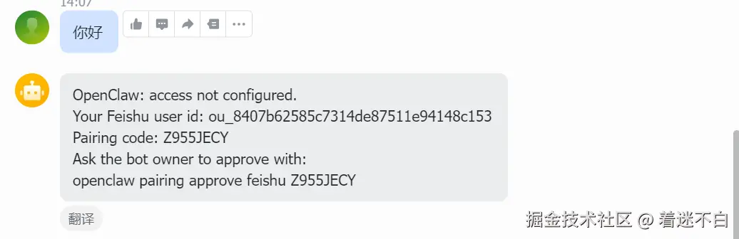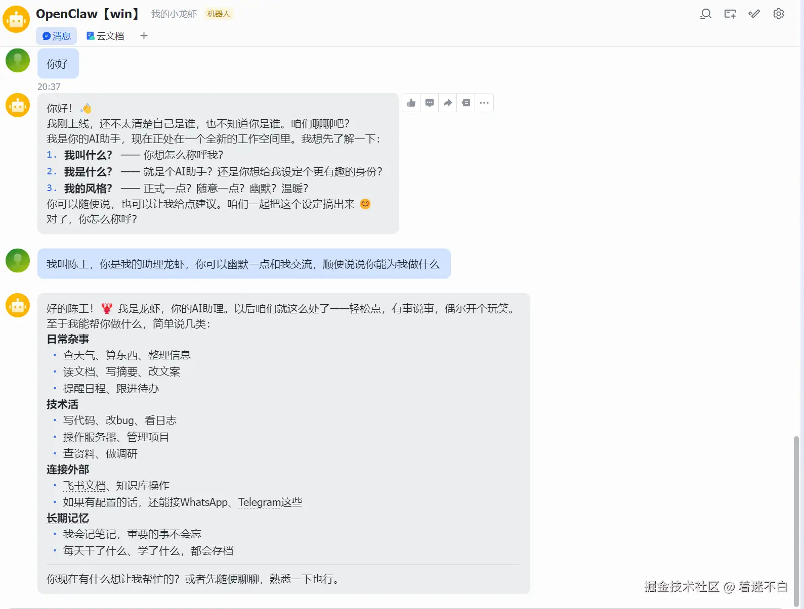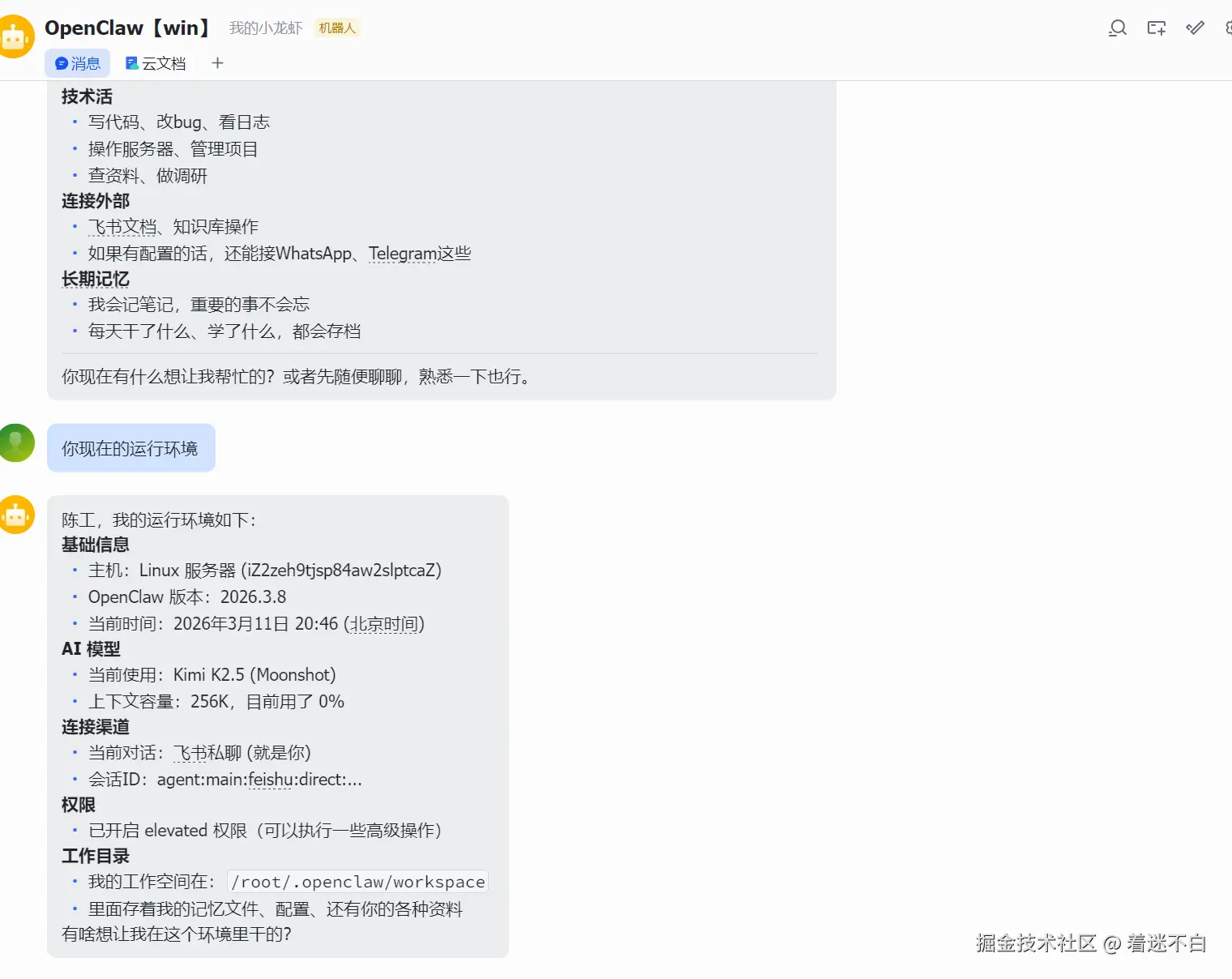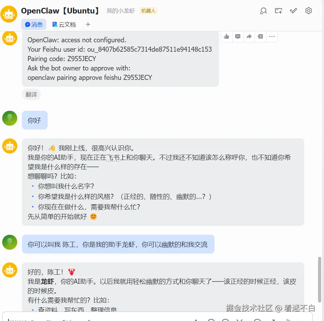 最后去飞书发信息测试,如图,已完成飞书机器人的配置