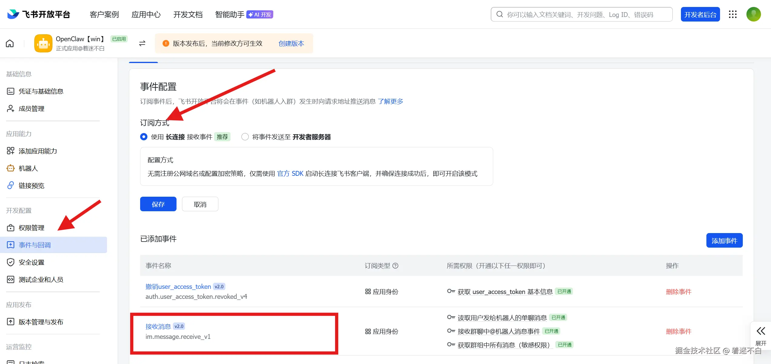 ⚠️ 注意:在配置事件订阅前,请确保已完成 OpenClaw 渠道添加并启动网关。