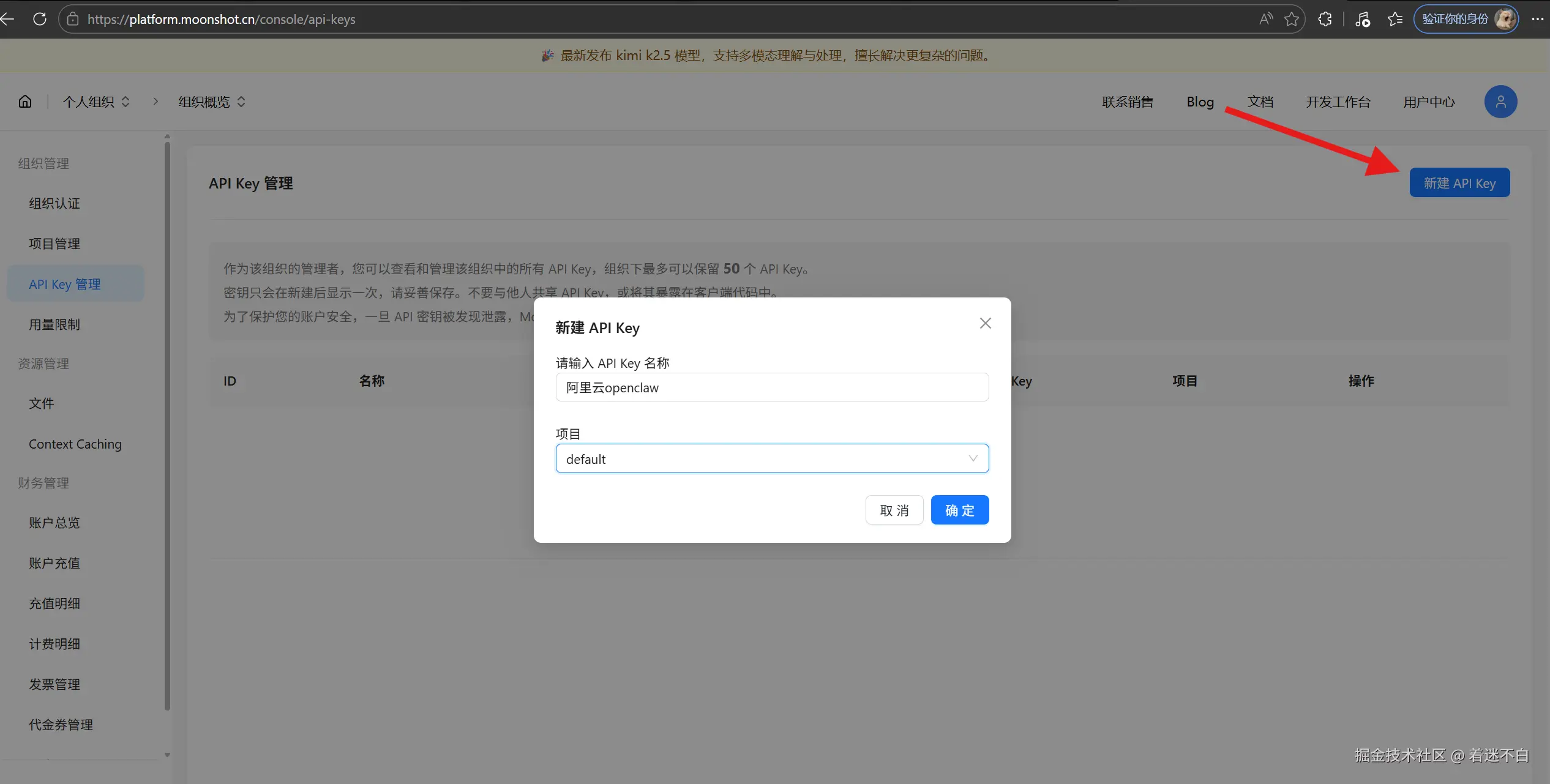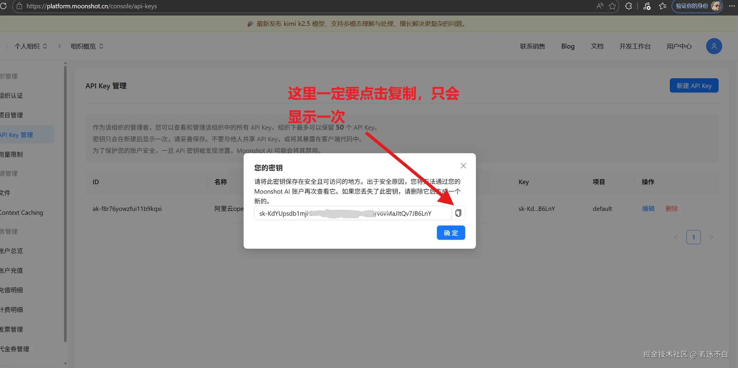 左侧菜单选择API Key管理 ,然后新建,名字自己随便起,点击确定后先把密钥复制