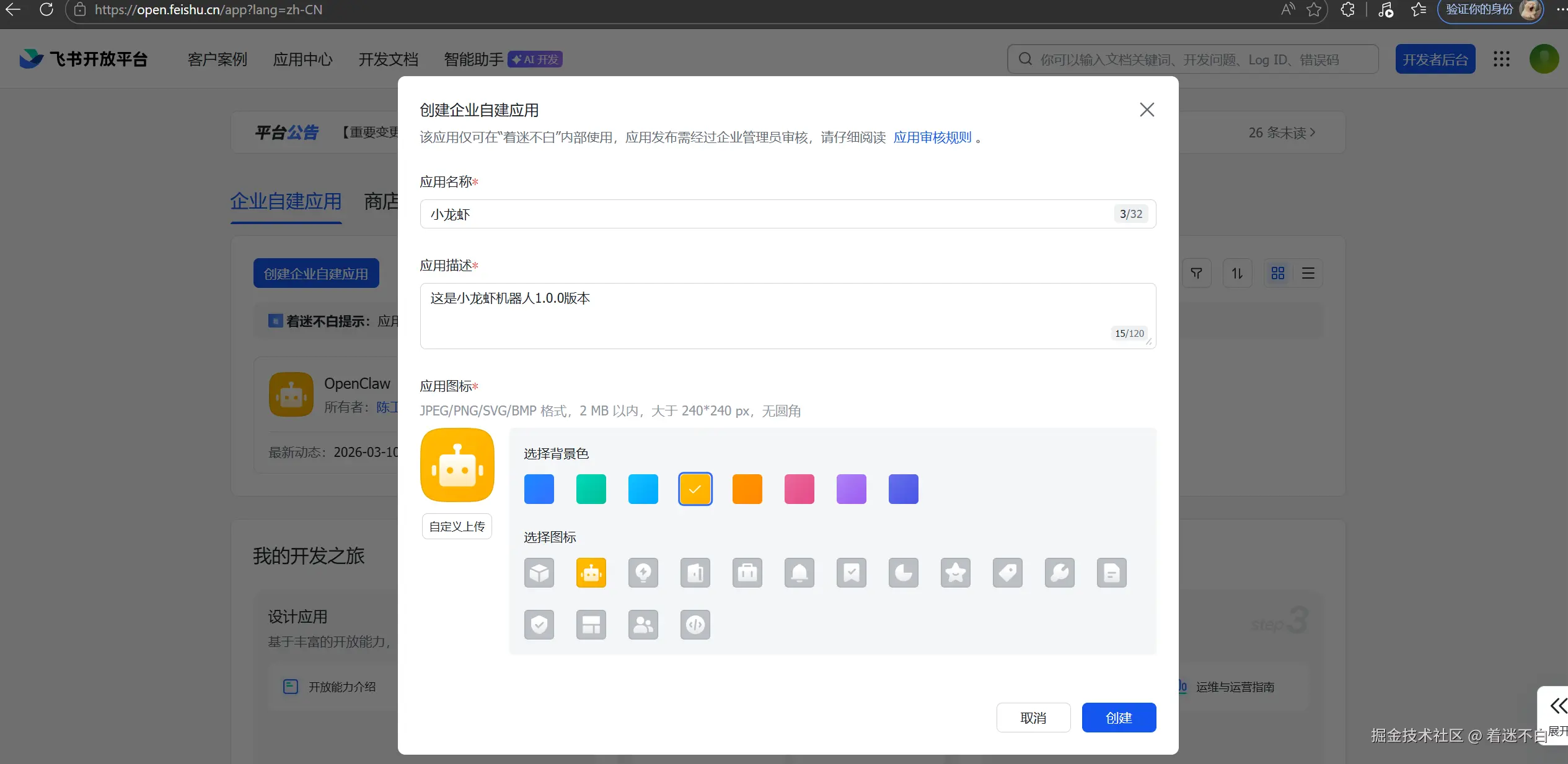 填写名称和描述,然后创建应用,可以定义他的图标和颜色,我这里已经有一个机器人了,我就不创建了